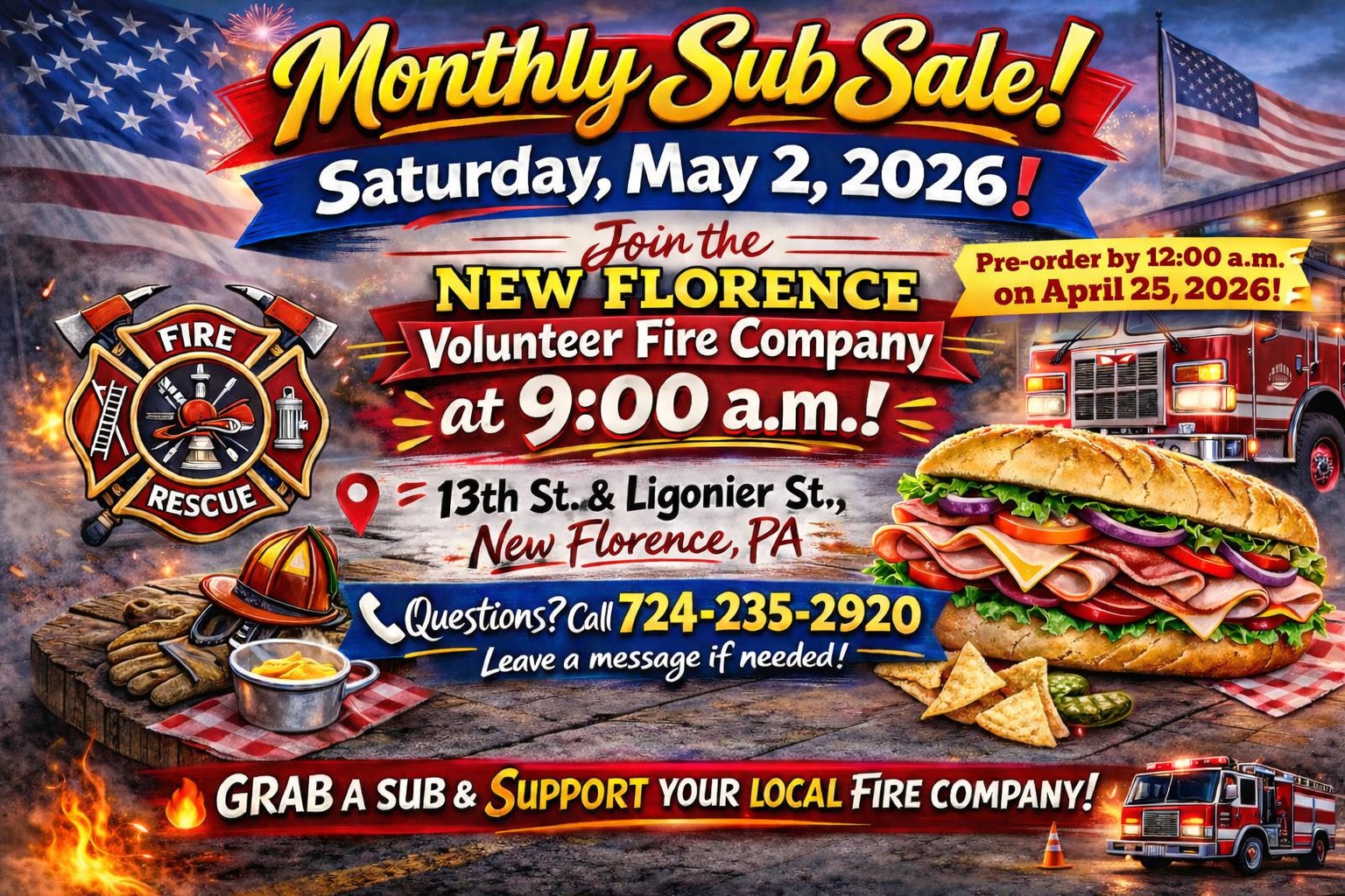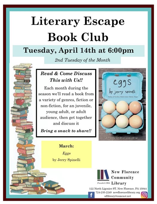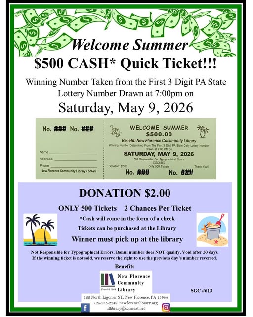 Here are quite a few additions to the website. First, Chief Patrick M. Goggin of the St. Clair Township Police Department provided the Police Report – March 2026 for the website. Next, the New Florence Volunteer Fire Department has four upcoming events. They will have their monthly sub and rippie party events on May 2nd. They are having a basket party on May 17th and then they will be hosting a spaghetti dinner on April 19th. After that, the Ligonier Valley Varsity Football team will be having another sub sale on Saturday, April 11th. Finally, the Florence Community Library will be hosting their Literary Escape Book Club meeting on Tuesday, April 14th at 6 pm. The library also has a Welcome Summer $500 CASH Quick Ticket fundraiser that goes off on Saturday, May 9th. Please see the flyers below or the Calendar for more information. Thanks.