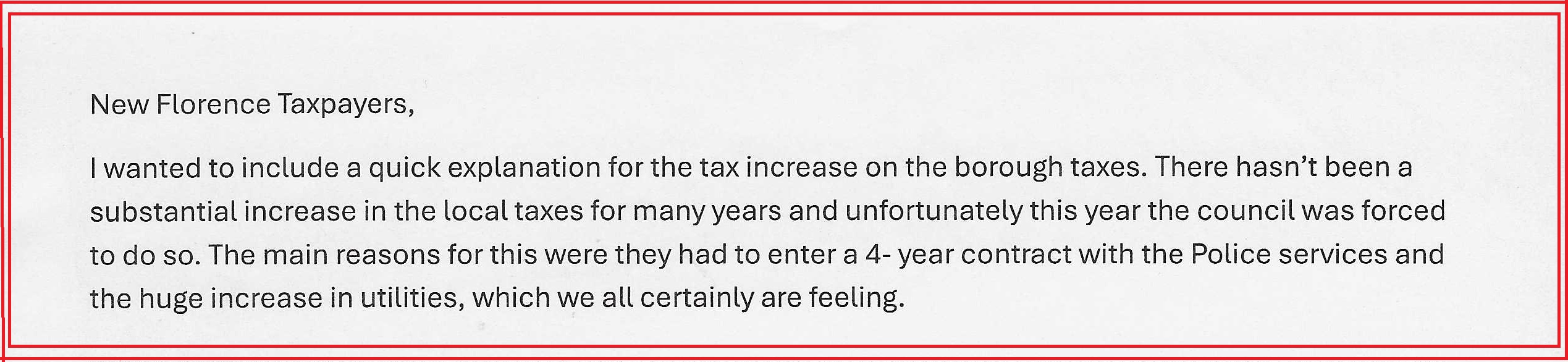Here are a few older additions to the website. First, the New Florence Volunteer Fire Department now has their own website in addition to their Facebook page. The website is www.nfvfc46.com. The site is still under construction but it’s coming along nicely. Please check it out. Next, it’s that time of the year where the spring tax bills are being sent out. Mine arrived this past week. Included with the tax statements is a notice regarding the rationale behind the rate changes and why the bills are slightly more this time. I’ve included the statement below for those who haven’t received theirs yet. Thanks.