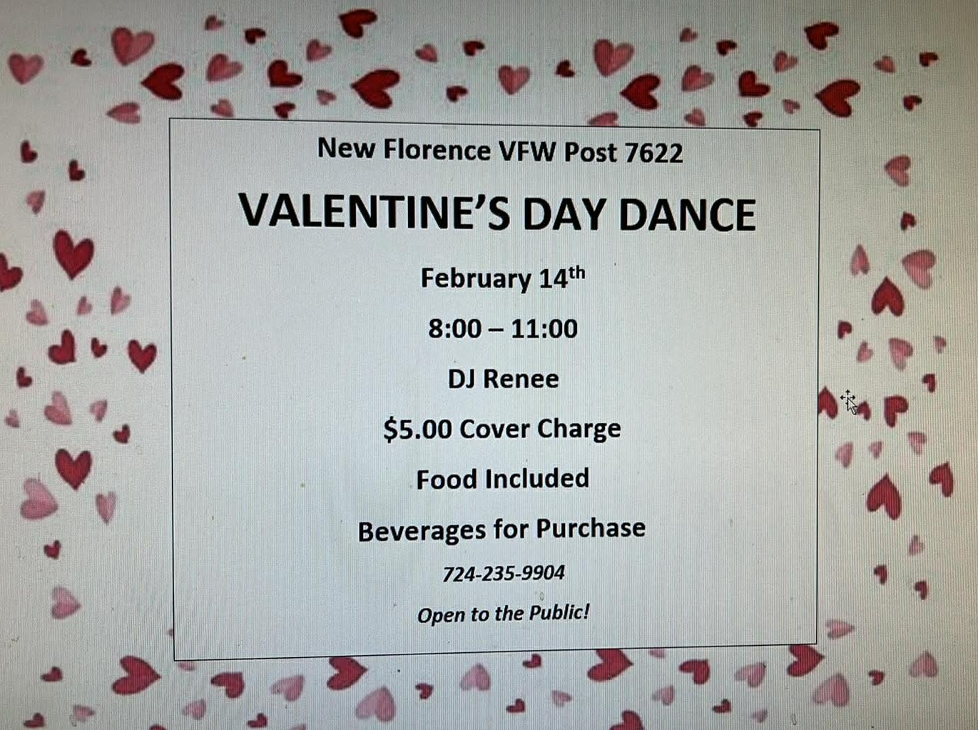 The New Florence Veterans of Foreign Wars (VFW Post 7622) will be having a Valentine’s Day Dance hosted by DJ Renee. The dance is open to the public so bring your sweetheart for a fun night out! There is a $5 cover charge. There will be food for guests and drinks are available for purchase. For more information give the club a call at 724-235-9904. Thank you.
