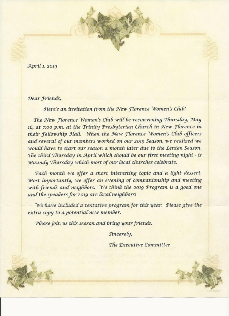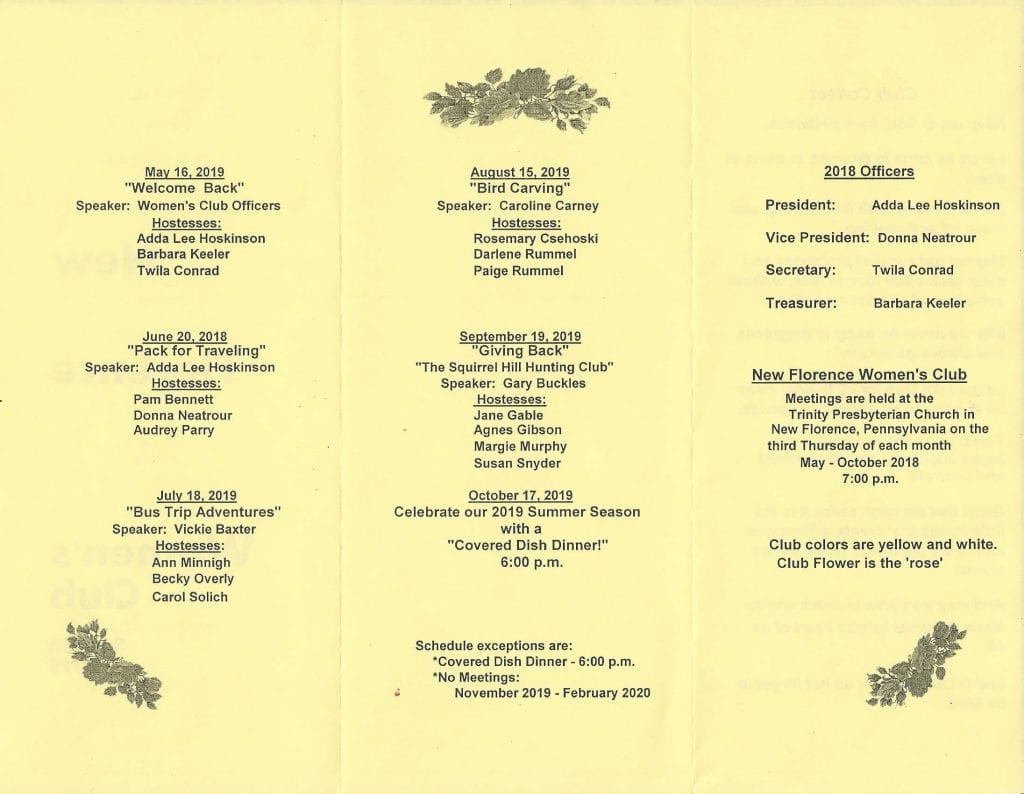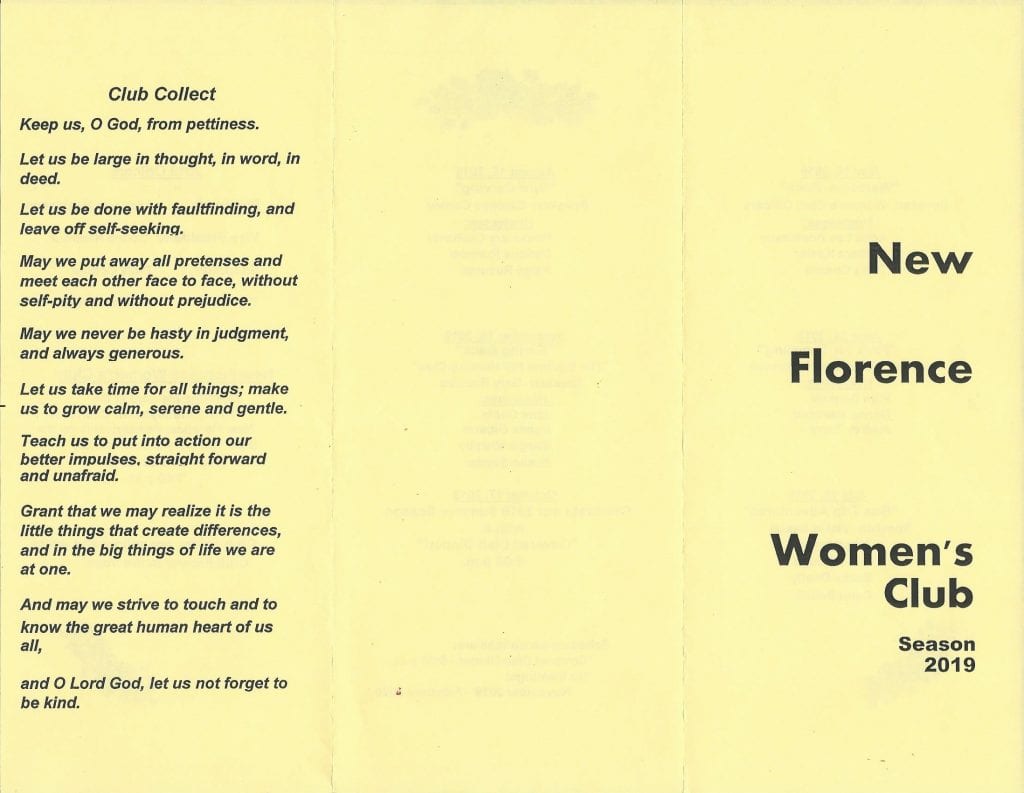 The New Florence Women’s Club is starting up for another season. Please check out the attachments below. All are welcome and the club has a lot of fun. Please consider joining in on all the activities. The yellow brochure was folded twice so the scans may seem a little funny. Fortunately, all the information is there.