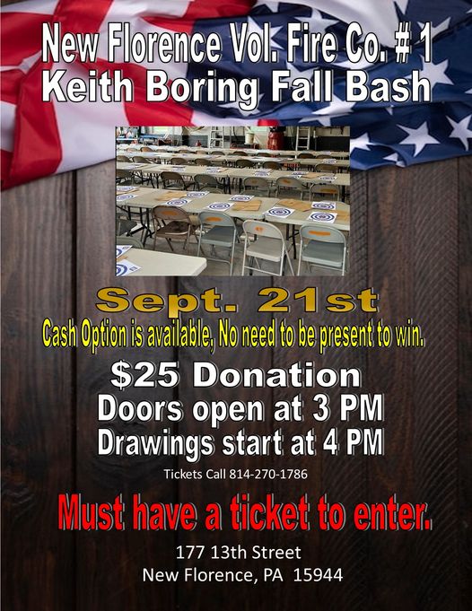 The New Florence Volunteer Fire Department will be holding their Third Annual Keith Boring Memorial Fall Pistol Bash on Saturday, September 21st, 2024. The doors open at 3 pm. This is a great fundraiser for the fire department. Please come out and support them. Thank you.