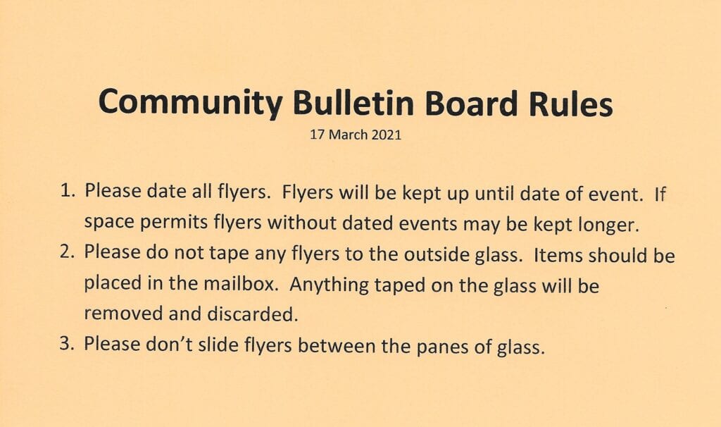 Lots of good information is posted on the community bulletin board located at the post office. Please remember to follow the rules. Lately, several flyers have been taped to the glass.