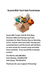 Two items were added to the Events Calendar today. The first is a fundraiser for Scouts BSA Troops 1123 & 2123 that meet at the New Florence United Methodist Church. The scouts will be doing a yard sale fundraiser on Saturday, June 5th during New Florence’s town-wide yard sale. They are looking for donations of items to sale. Please see the flyer for more information. Next, the Squirrel Hill Hunting Club will hold their 6th Annual Lifetime Hunt for Kids Golf Outing on July 18th, 2021 at Champion Lakes Golf Resort. The fundraiser benefits children with a life-threatening illness. Their flyer contains additional information on how to participate. Please click on the flyers to see larger images. Thank you.