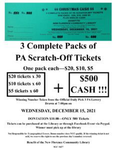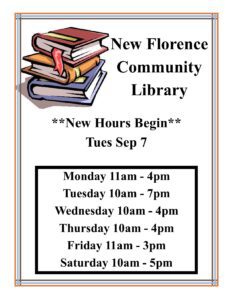 Several items were added to the website. First, the New Florence Community Library would like everyone to know they are changing their hours. The new hours that go into effect 7 September 2021. The library will also be conducting a PA Scratch-Off Tickets fundraiser later this year. The drawing will be Wednesday, December 15th, 2021. Finally, the VFW is advertising a Flight 93 Memorial motorcycle ride. Please look at the items on the Events Calendar or check out the flyers below for details. Please continue to click on the image to see a larger version.