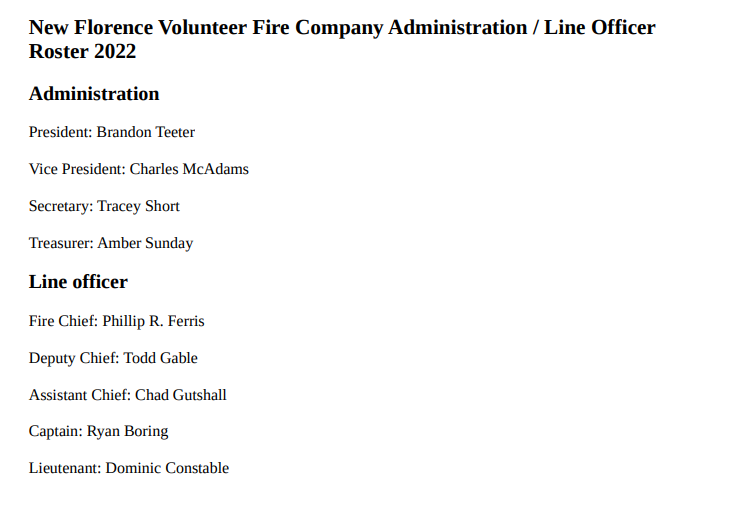 The agenda for this month’s borough council meeting is now available. AGENDA 12-21-21 Next, the New Florence Volunteer Fire Department announced their administration and line officer appointments for 2022. The firemen will also be helping Santa tour the town on December 24th starting around 11 am. Kids, big and small, come out and wave to Santa. Finally, there will be a special borough council meeting on January 3rd to reorganize the council and make appointments.