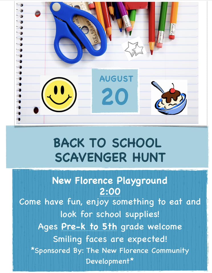 Don’t forget, today August 28th is the first day of school for the area. Please be careful of all the kids out there. Also, don’t forget you have to stop for school buses when the red lights are flashing. Next, the New Florence Community Library would like to remind everyone they are now on their regular hours. Did you know the New Florence Recreation Board recently purchased new picnic tables from Tim Waulk. He makes the tables by hand locally. The board is very proud of the beautiful tables now at the playground. Please contact the board if you’d like to get your own table from Mr. Waulk. Don’t forget, the New Florence Volunteer Fire Department will be having their next rippie party on September 2nd. They will not be having a sub sale that day due to the holiday weekend. Finally, the New Florence Community Development committee will be holding a basket raffle during the September 16th Vendor & Craft Fair. They are looking for donations from businesses, organizations, or individuals of baskets or gift cards for the raffle. If you’d like to donate, please reach out to the committee or Misty Clawson via Facebook Messenger by September 13th. All donations will be greatly appreciated. Thank you.