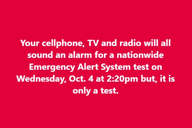 There will be a nationwide test of the Emergency Alert System on October 4th at 2:20 pm. Most, if not all, electronic devices will sound the alarm. This is only a test. Here is the press release for the test. FEMA and FCC Plan Nationwide Emergency Alert Test for Oct 4 2023