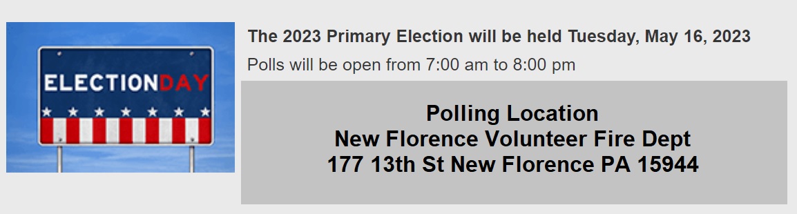 Here are a few items for area residents. Primary Election Day in Pennsylvania is May 16th for 2023. The New Florence Volunteer Fire Department is the polling location with the polls open from 7:00 am to 8:00 pm. Next, the New Florence VFW Post 7622 is accepting donations for the Scratch Off Lottery tree raffled off during their gun bash on June 10th. See the flyer below for more information. Finally, in April of 2023 Jim Moore, borough council President, was provided a series of documents from the New Florence/St. Clair Sanitary Authority associated with the creation of this organization. The documents are Bylaws of New Florence – St. Clair Township Sanitary Authority, Resolution to Create New Florence – St. Clair Township Sanitary Authority 28 September 2000, and Articles of Incorporation New Florence – St. Clair Township Sanitary Authority. These are apparently final draft documents. If the original executed, signed documents can be obtain then they will be posted. Have a great week everyone.