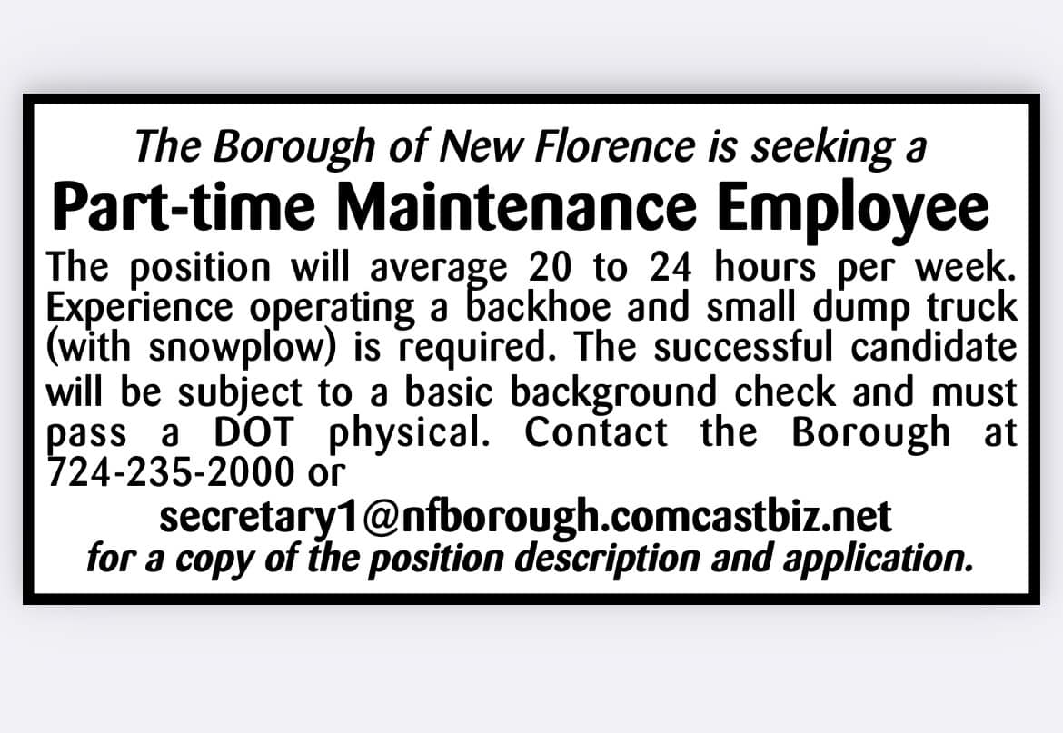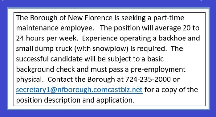 Here is the agenda for this month’s borough council meeting. AGENDA 04-18-23 Also the borough will be hiring a new maintenance individual. Please see the job announcement below that was posted in the newspaper.