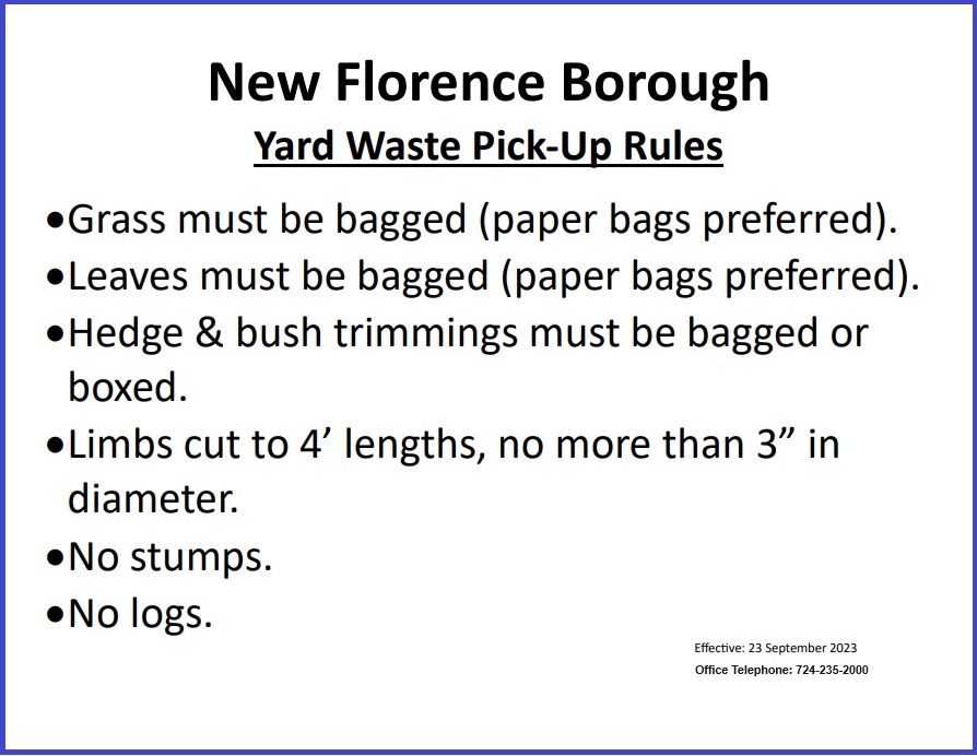 The New Florence borough operates a yard waste disposal area back 15th street. Residents of the borough may deposit sticks, limbs, brush, grass, and leaves in the center of the area. Clean fill may be dumped along the perimeter. No stumps, logs, garbage, or concrete are permitted. The area is under video surveillance. Please do not violate the rules. There have been several cases of individuals leaving garbage. Law enforcement gets notified and citations can be issued. Please don’t abuse this great service provided by the borough. Thank you.