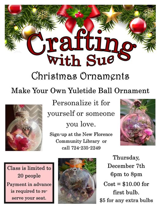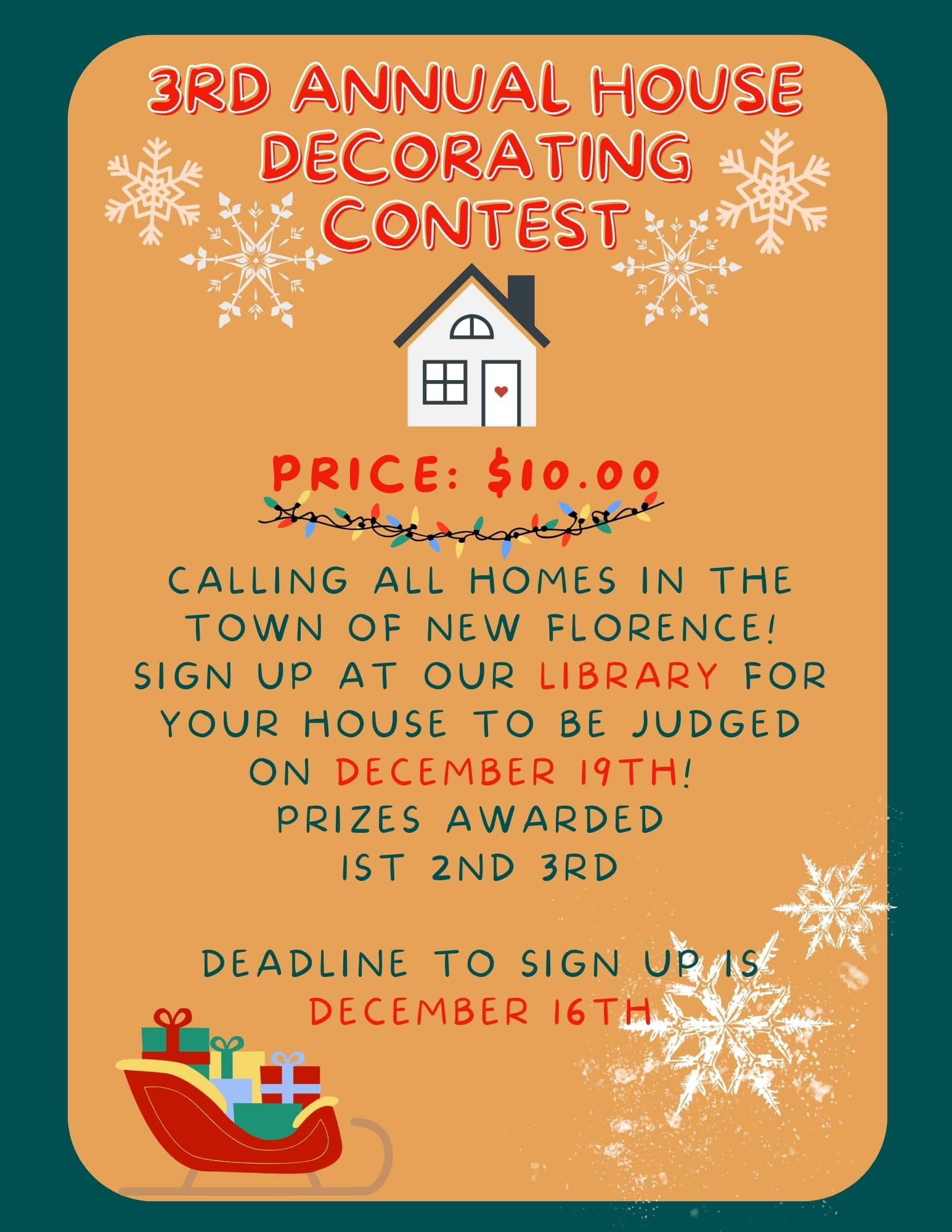 There are quite a few updates to the website. First, the New Florence Volunteer Fire Department will be having another sub sale and rippie party on December 2nd. Also, don’t forget, their basket party will be on Sunday, November 19th. Keep in mind, the fire department is always looking for volunteers to help. Please consider joining the organization. You can contact the fire department to get more information. Next, the New Florence Community Development organization put out the flyer for the tree lighting ceremony on December 3rd at 6pm. They will also be holding a house decorating contest again this year. The deadline for signing up is December 16th. Finally, the New Florence Community Library has a few things going on. They have a lot of Christmas baskets available for purchase. Stop by the library and pick up a few. They are also having another “Crafting with Sue” event. Participants will make their own yuletide ball ornament. They are also having a Holiday Storytime on November 25 for the kids ages 3 to 11. See all the flyers below for more information.
