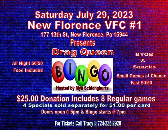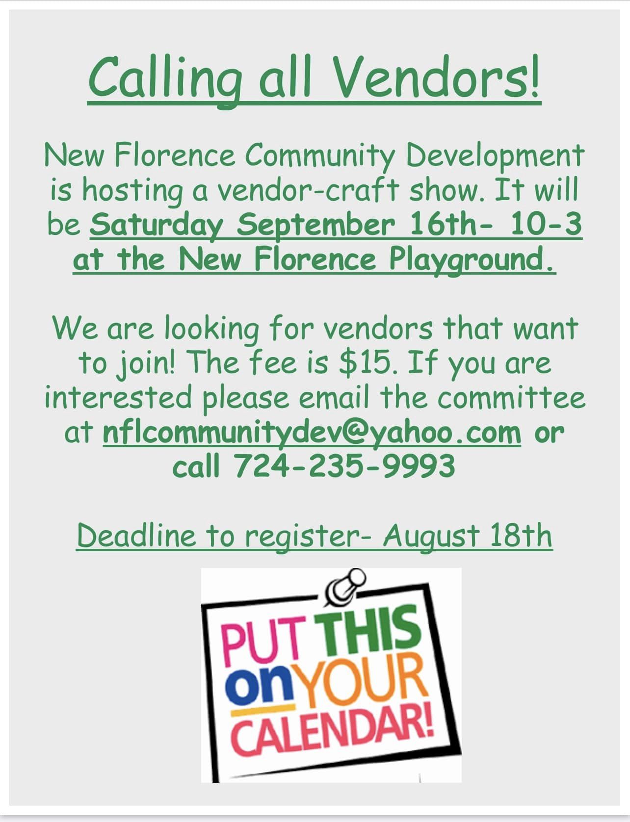 The New Florence Community Development released some more information on the vendor & craft show they are hosting at the town playground on September 16th. The deadline for vendors to register is August 18th. The group also announced they will be having a “Back to School Scavenger Hunt” on August 20th. This is a fun event for the kids of the borough. Next, the New Florence Volunteer Fire Department would like everyone to know their next sub sale will be on August 5th. This was originally announced as a chicken BBQ, but the event has been changed to a sub sale. They’ll also have a rippie party that evening. Also, they’d like to remind everyone they are having a drag queen bingo on July 29th. Please check out the flyers below for more information. Thanks all.