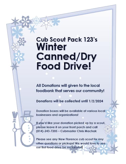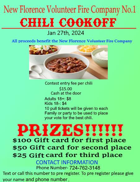 A couple of events were added to the website for the start of the new year. First, New Florence Cub Scout Pack 123 is having a Winter Canned/Dry Food Drive through January 2nd, 2024. Next, have you heard? The New Florence Volunteer Fire Department will be having a Chili Cookoff on January 27th. There are great prizes and hopefully, lots of good eating. Finally, there will be a special New Florence borough council meeting on January 2nd. This meeting will be to appoint new members to the council. Please see the flyers below for more information on these events. Thank you.