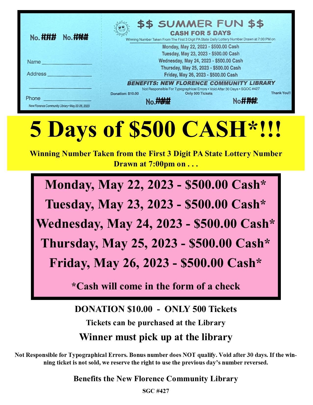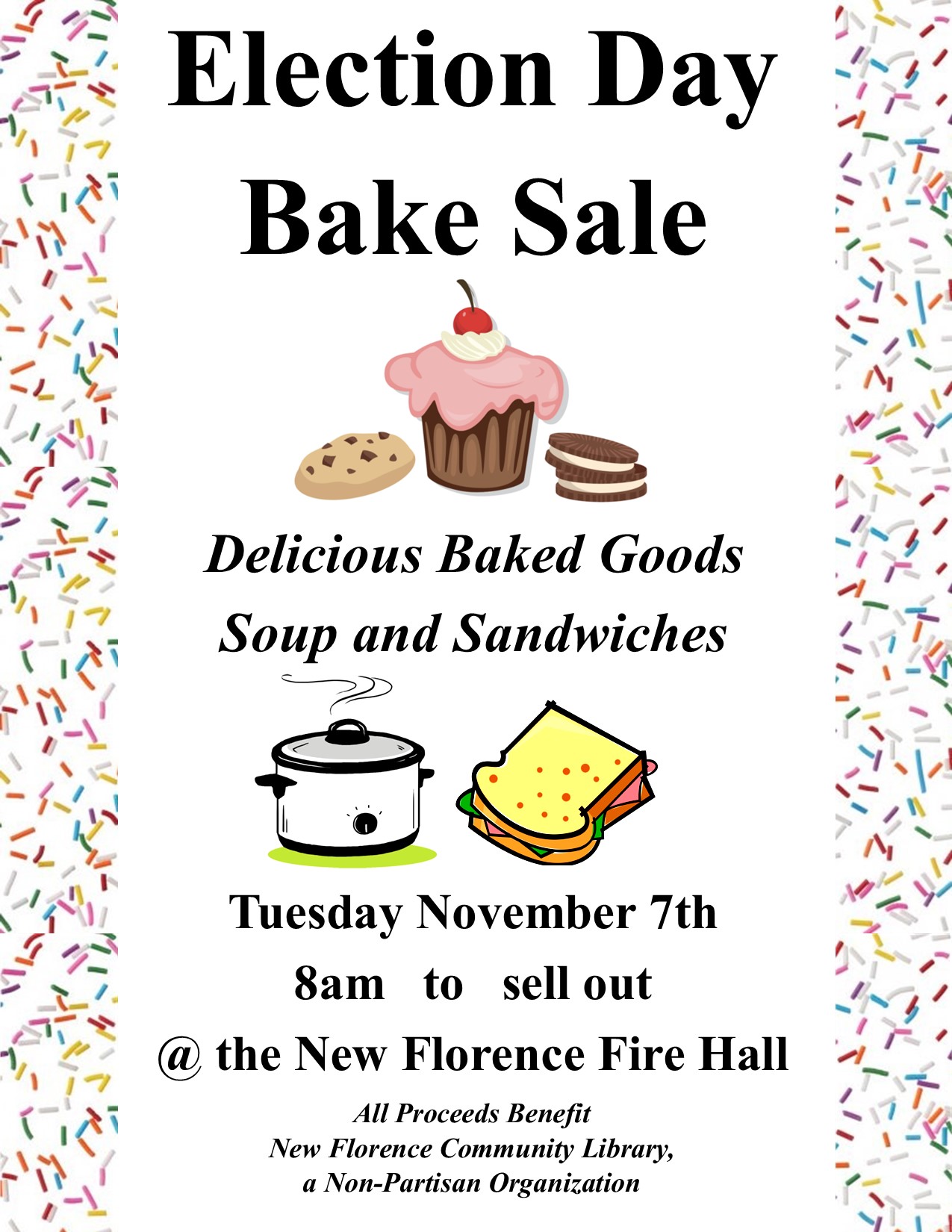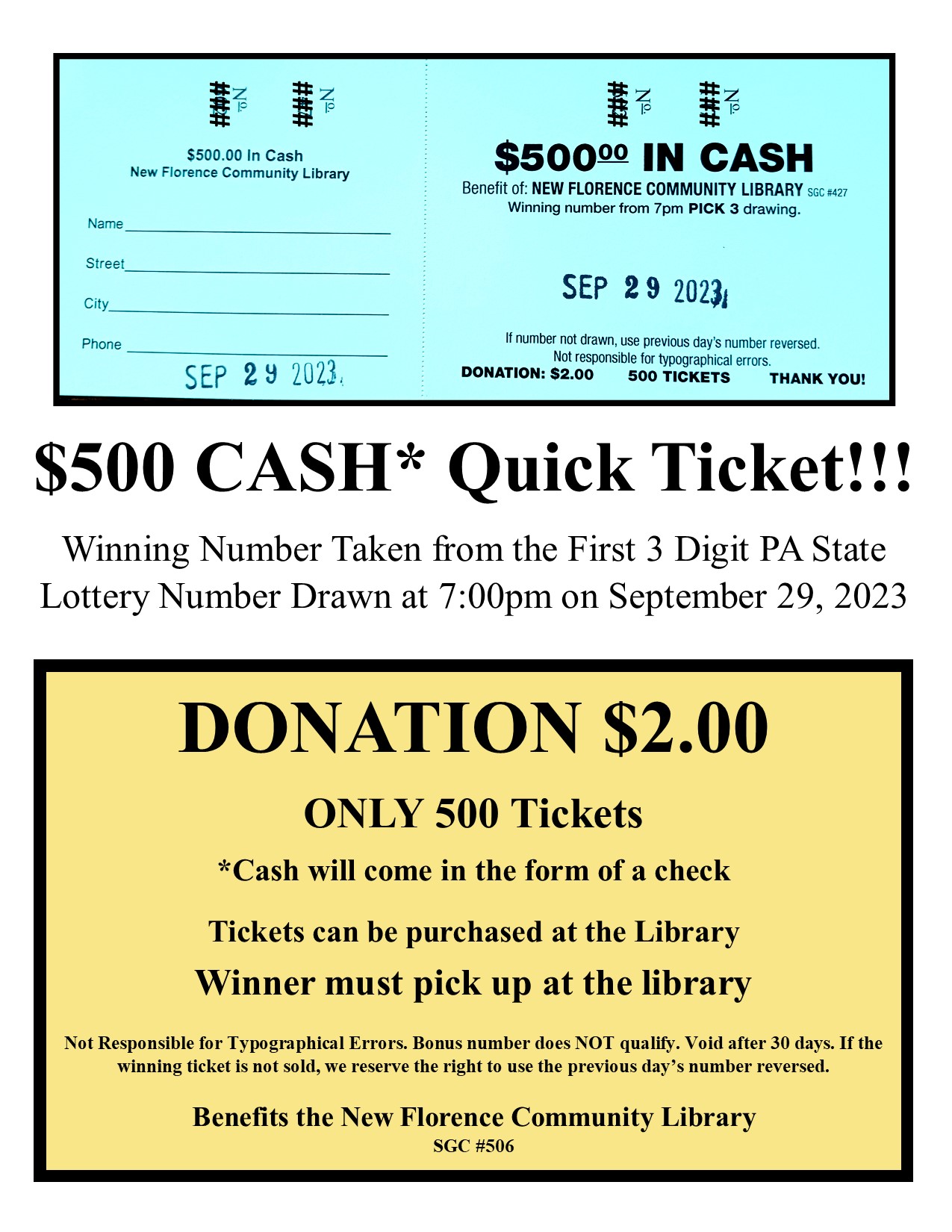 The New Florence Community Library has two upcoming events. First, they will again be holding an Election Day Bake Sale on November 7th at the fire hall. Next, the library is doing a raffle ticket fundraiser. It is “Pay Off Christmas” $500 CASH* Quick Ticket!!! which goes off on December 26, 2023. See the flyers below for more information.