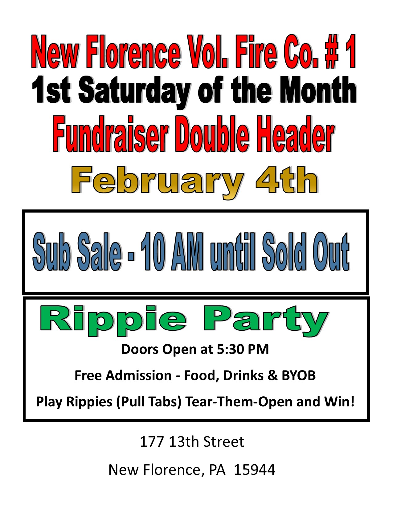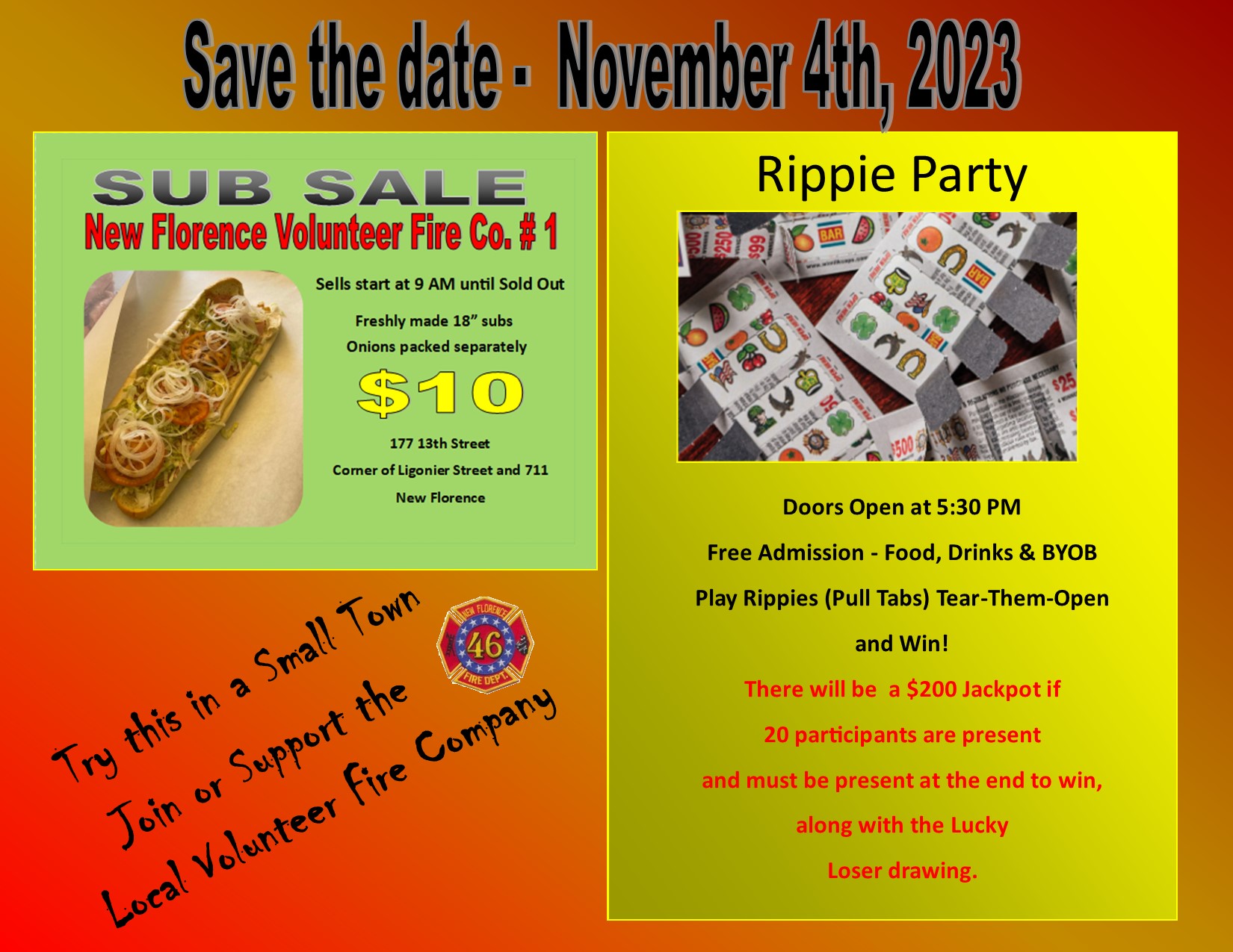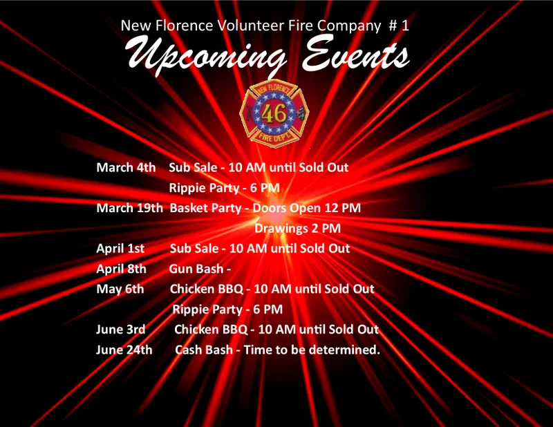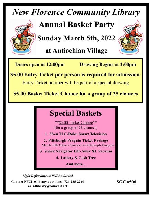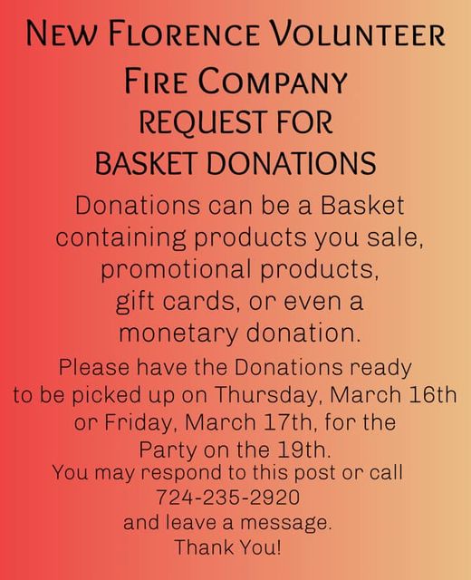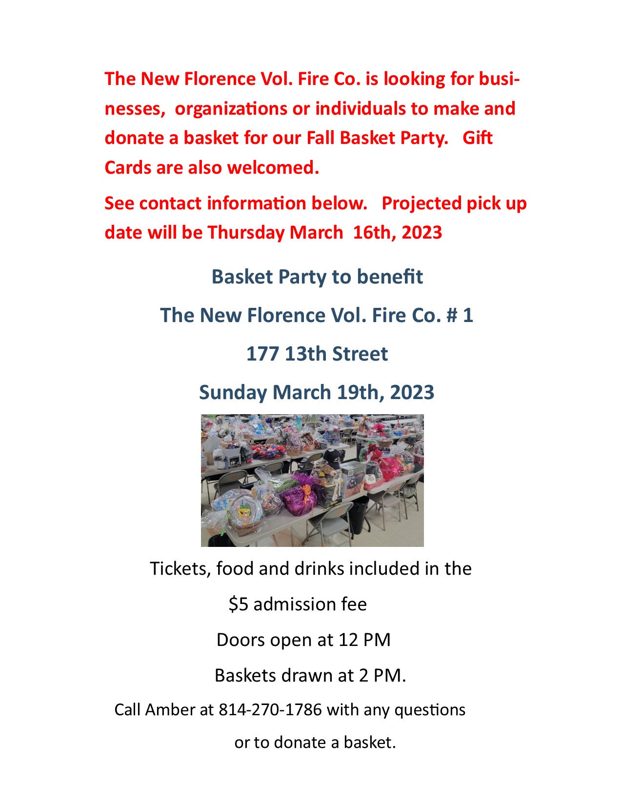 The New Florence Vol. Fire Co. #1 is having a Basket Party on Sunday, March 19th, 2023. The VFD is looking for businesses, organizations, or individuals to make and donate a basket for their Basket Party. The fire department will also be having their next sub sale and rippie party on March 4th. Also, the New Florence Community Library has cancelled their upcoming February 28th #READERS group for the month. See below for more information.