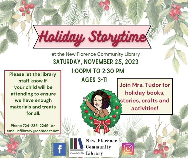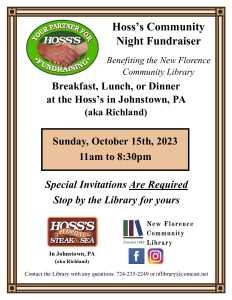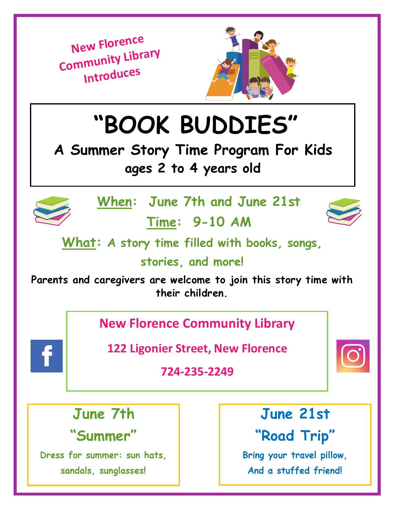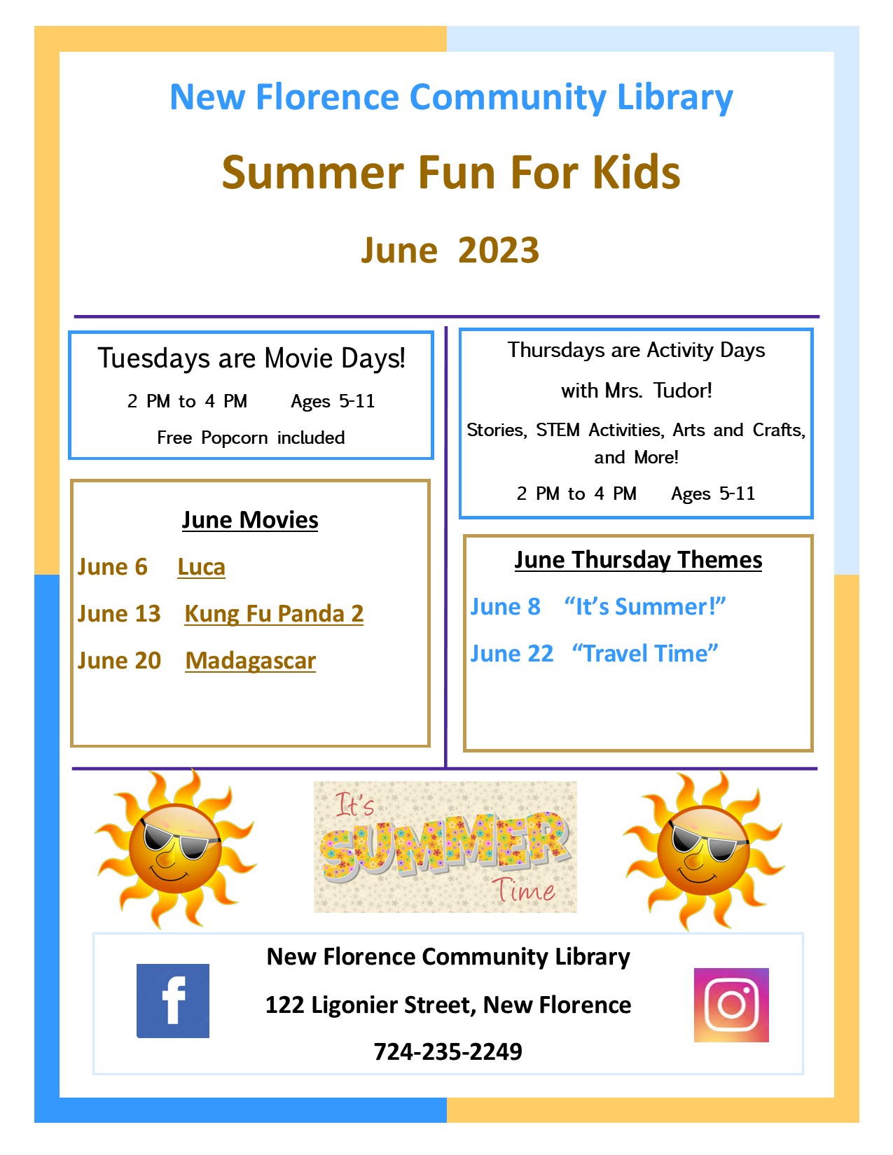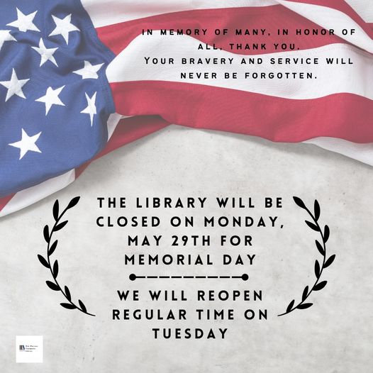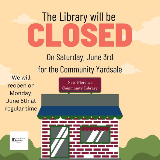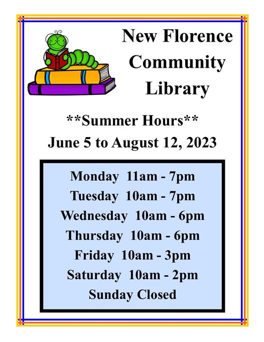 Everyone, please have a safe and happy Memorial Day. Don’t forget to attend the 2023 Memorial Day Parade, Monday the 29th, starting at 9:30 am. The parade route starts at 19th Street, goes down to the 13th Street/Route 711 intersection, and then takes a right onto 13th Street and finishes at the New Florence VFW. Groups participating in the parade will form up at 9:00 am. The New Florence Community Library will be closed that day.