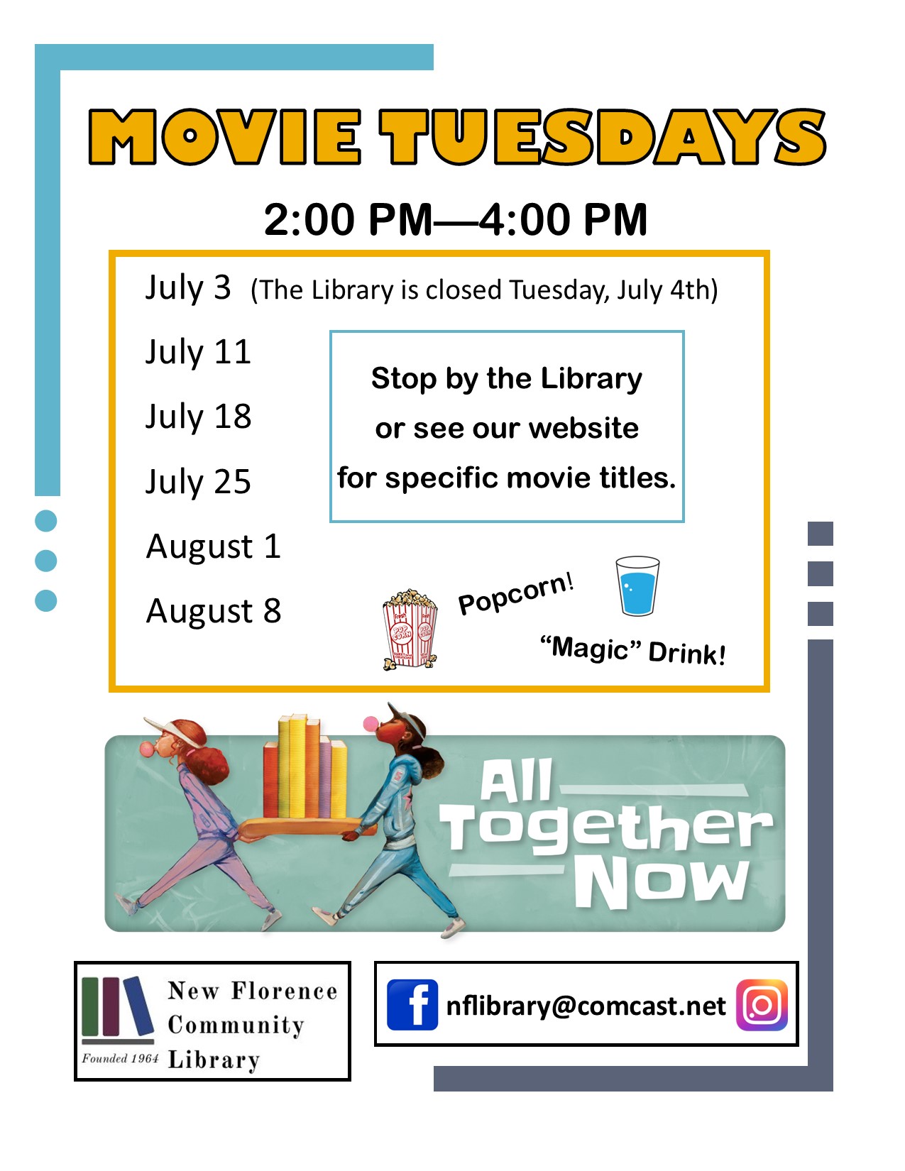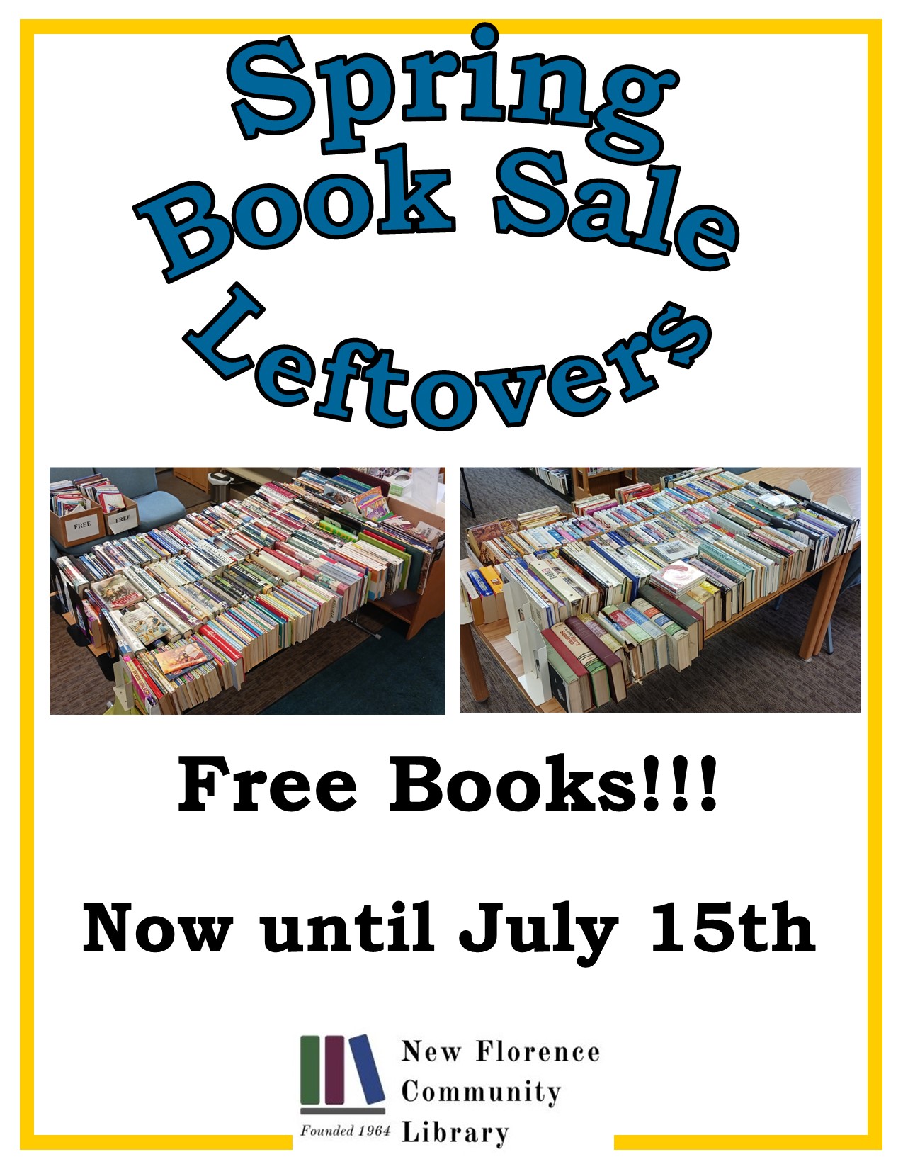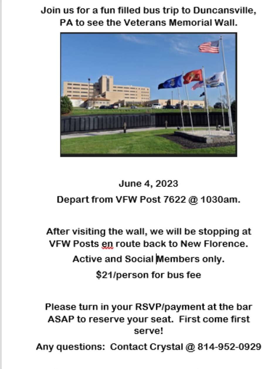 Everyone, please have a safe and happy Memorial Day. Don’t forget to attend the 2023 Memorial Day Parade, Monday the 29th, starting at 9:30 am. The parade route starts at 19th Street, goes down to the 13th Street/Route 711 intersection, and then takes a right onto 13th Street and finishes at the New Florence VFW. Groups participating in the parade will form up at 9:00 am. The New Florence Community Library will be closed that day.