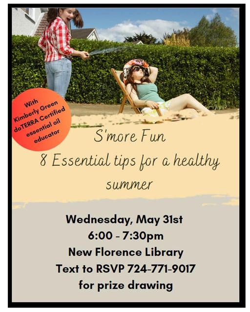 The library is having Kimberly Green do another Essential Oils talk on Wednesday, May 31st. The program is free. Text 724-771-9017 to register and to be entered into a free drawing! If you need more information, give the library a call. Thanks.