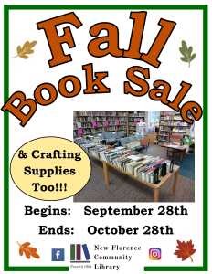 Here are a few updates for the website. The New Florence Community Development committee put out two flyers yesterday. The one is for their pumpkin carving activity and the other is for the Halloween Parade associated with trick or treating. Then the New Florence Community Library provided updated images for their Hoss’s fundraiser and their big fall book sale. The resolution is much better for enlarging and reading. These have been swapped in for the previous images. Have a great day everyone.