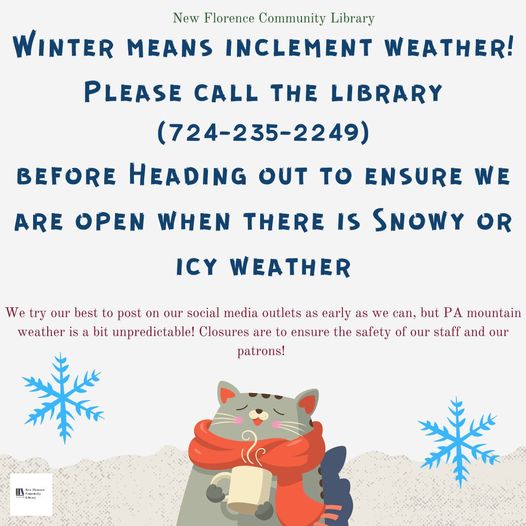 Besides the election results, the New Florence Community Library would like to remind folks that winter is almost here. In case of bad weather, please call the library to make sure they are open. Thank you.