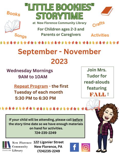 A couple of items were added to the website. First, Chief Jeffrey Janciga of the St. Clair Township Police Department provided the Police Report – August 2023 for the website. Next, the Laurel Valley Area Historical Society will be holding their monthly meeting on September 13th at the West Fairfield Auction Barn. Finally, the New Florence Community Library would like to remind folks of the fall program they have for the littlest readers. Please check out the flyer below. Thanks.