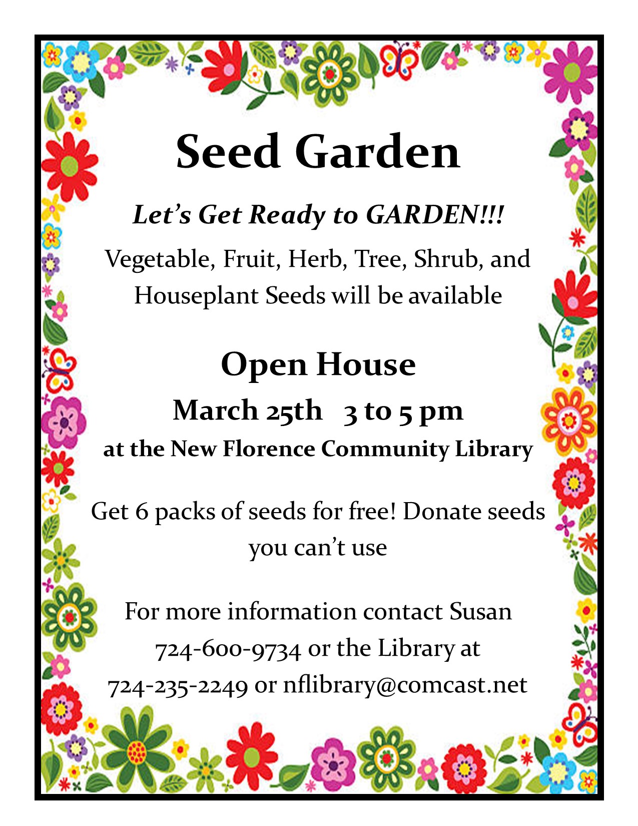 Here is the agenda for this month’s borough council meeting. AGENDA 03-21-23 15 March 2023 Here are the minutes from the January borough council meeting. MINUTES 01-17-23 Also, the council would like to remind residents they are still looking for a volunteer to be on the New Florence/St. Clair Township Sanitation Authority. If you are interested, please call the borough office. The New Florence Volunteer Fire Department is doing a last minute call for basket donations. If you’d like to donate someone will be at the fire hall both Thursday and Friday evening from 5 to 8 pm for drop-offs. Several of their upcoming events were also added to the Events Calendar. Additionally, the fire department would like to remind folks the social hall is available for rent. Having a party? Please consider the fire department building as a possible choice. Next, the New Florence Community Library has several upcoming events. On March 25th they are going to hold a seed exchange. They’ve also announced they will be doing a Summer Fun fundraiser the end of May. Please see below for more information on all of these items.