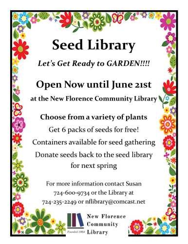 Here are the minutes from the February, not January, borough council meeting. MINUTES 02-21-23. Also, Chief Jeffrey Janciga of the St. Clair Township Police Department provided the Police Report – March 2023 for the website. Finally, the New Florence Community Library has something to say. Attention Gardeners!! The Library’s Seed Library is open from now until June 21st. Stop by, pick up some information, and choose up to 6 packets of seeds to try. Got seeds from last year? Interested in donating them? Bring them along or drop them off at the library. Thanks!