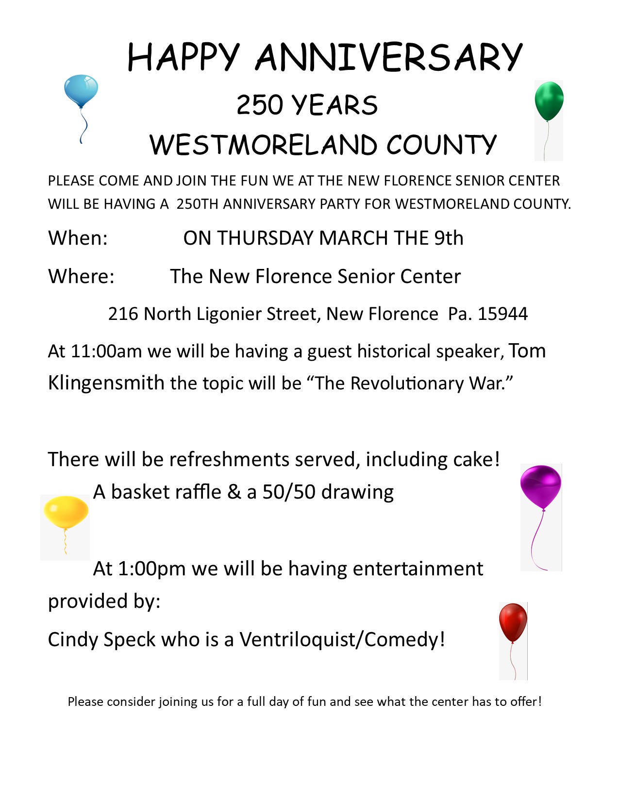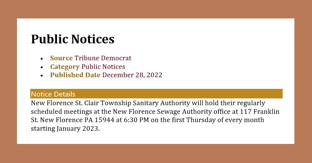 Here are the minutes of the December 2022 borough council meeting. MINUTES 12-20-22 Next, the New Florence Senior Center has four upcoming events. There will be a party celebrating the 250th anniversary of the creation of Westmoreland County on March 9th. Also, they then have 3 upcoming bingos: Valentine’s Day, Mardi Gras, and St. Patrick’s Day. Please join the center for these fun activities. On December 28th the New Florence/St. Clair Township Sanitation Authority placed an ad in the Johnstown Tribune Democrat announcing a change to their monthly meeting schedule. Below is the notice. The monthly meetings have been added to the Event Calendar.