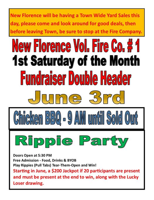 Several items were added to the website. First, here are the borough council minutes for the MINUTES 03-21-23 and MINUTES 04-18-23 meetings. Next, the New Florence Volunteer Fire would like everyone to know they are holding their annual fund drive. Their Annual Fund Drive Letter for 2023 was sent out last month. They would like to remind everyone that this is used for yearly operational needs, such as paying the utilities to keep them ready to respond to emergencies. A lot of times, they don’t get reimbursed for supplies they use on incidents. If you wish to donate electronically, you can do so on their Square Store page found through the fire department’s Facebook page. The flyers below give more information. Also, don’t forget the town wide yard sale is on June 3rd. The fire department will also be having their first chicken BBQ of the season and then a rippie party later that night. Please see all the flyers below for more information. Thank you.
