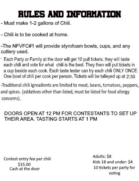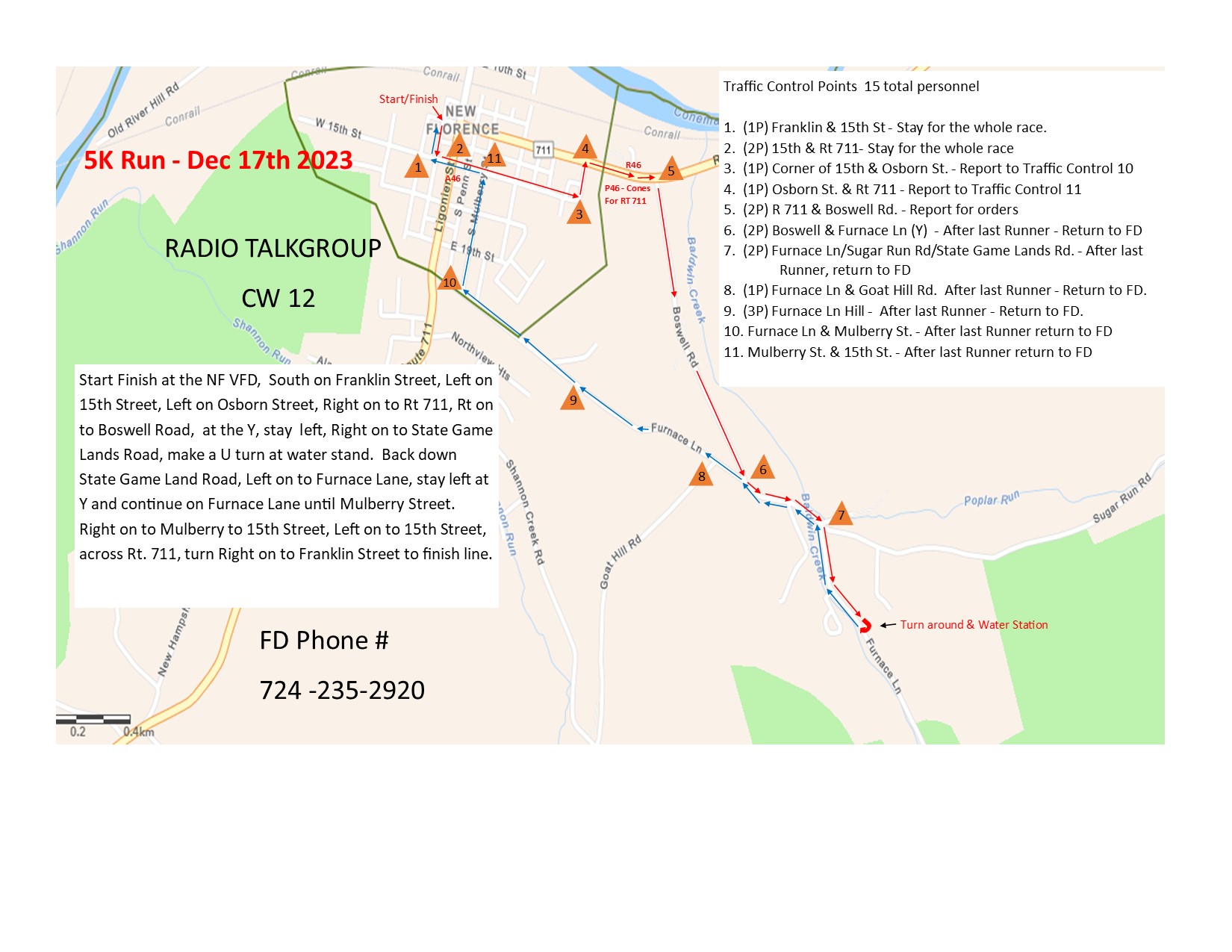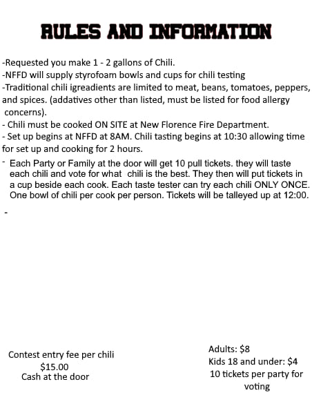 Don’t forget Sunday is the Festivus 5K race. Below is a copy of the course map. Please watch out for extra traffic and road closures. Also, Chase Oaks of the New Florence VFD provided updated flyers for the Chili Cookoff. They’ve changed some things. Chili can be cooked at home as long as the rules are followed as posted in the flyer. The time was also changed to allow people who can’t show up in the morning but can make the afternoon. Pre-Registry will be available during and after the 5k race all the way to January 10th. After January 10th you cannot enter the contest. Money for entry will be paid at the door. Please see the new posters for more information. Thanks.