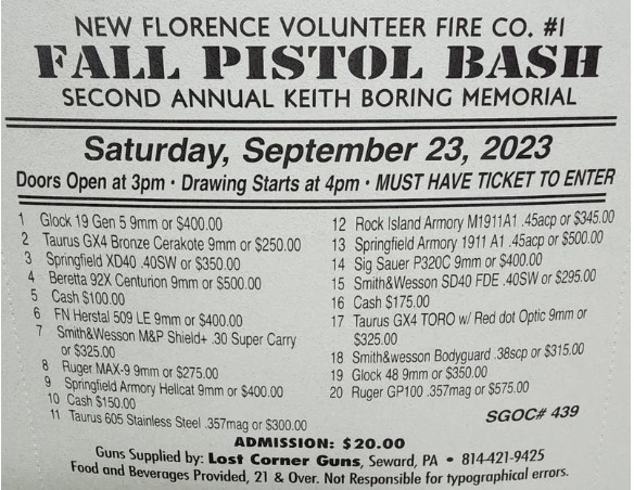 The New Florence Volunteer Fire Department will be holding their Second Annual Keith Boring Memorial Fall Pistol Bash on Saturday, September 23rd, 2023. The doors open at 3 pm. This is a great fundraiser for the fire department. Please come out and support them. Thank you.