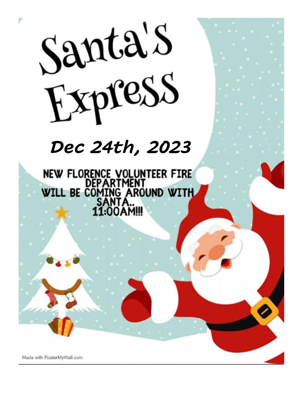 Here are a few updates to the website. The New Florence Volunteer Fire Department will be hosting the Festivus for The Rest of Us 5K race on December 17th. The fire department will also be helping Santa on December 24th. They’ll be driving Santa around the borough to see all the good little boys and girls. Have you been good? Please see the events in the calendar for more information, especially on the Festivus race. Thank you.