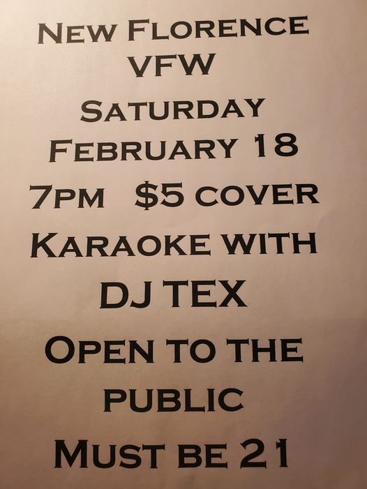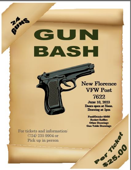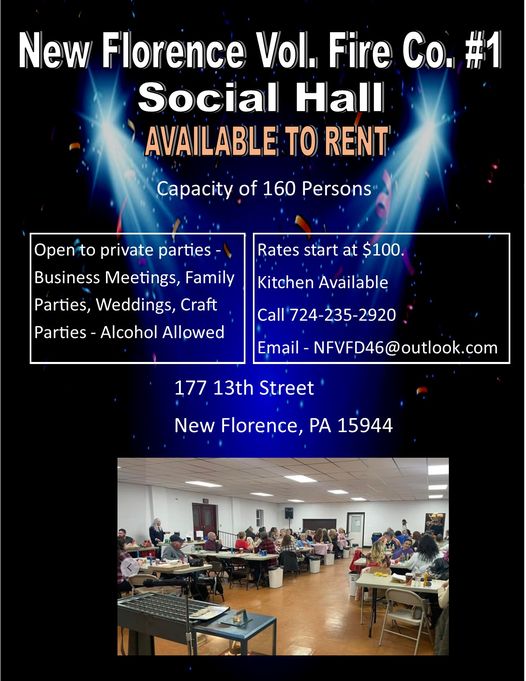 Here is the agenda for this month’s borough council meeting. AGENDA 02-21-23 16 February 2023 The New Florence VFW Post 7622 will be having a karaoke party on February 18th. The event is open to the public. Also, their 10 June 2023 Gun Bash tickets are available for purchase. Additionally, the New Florence Volunteer Fire Department put out a flyer of upcoming events. Below is more information.