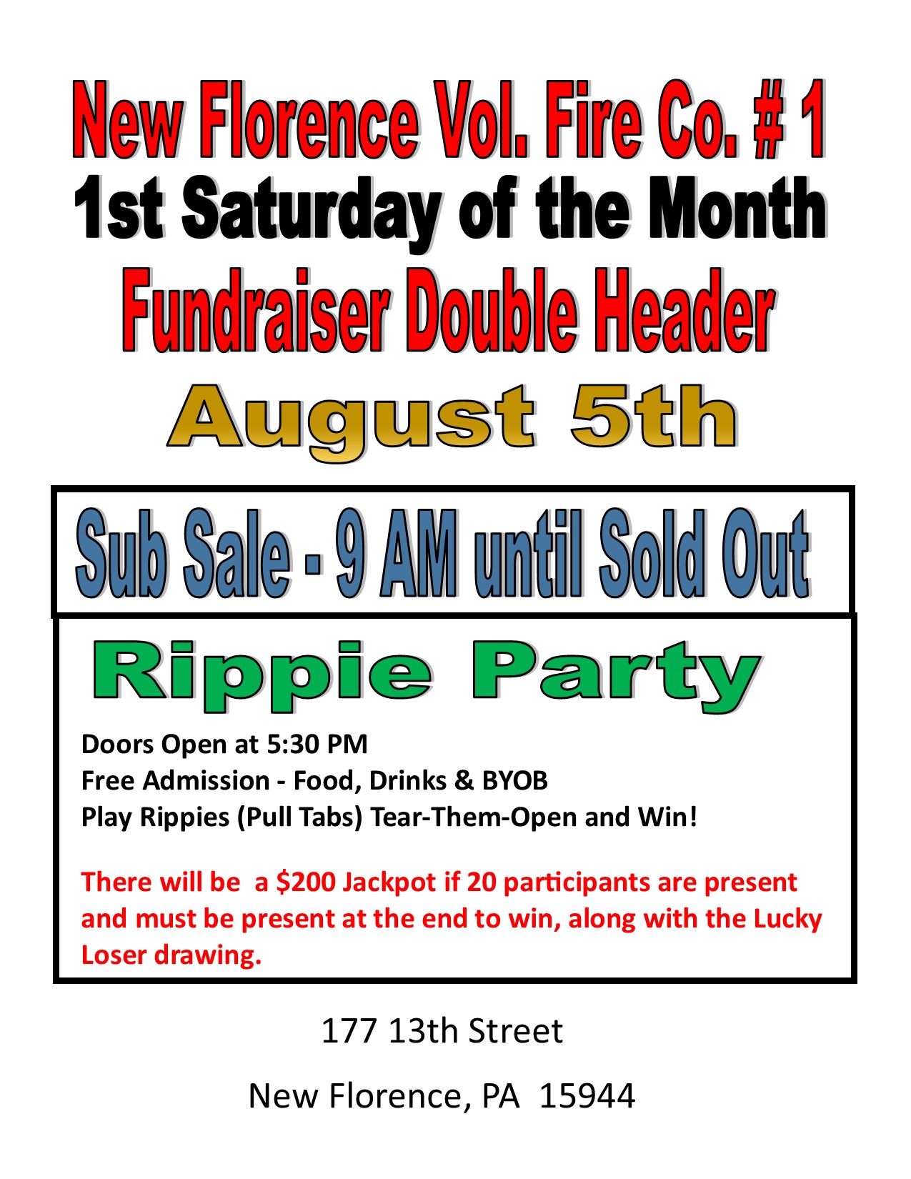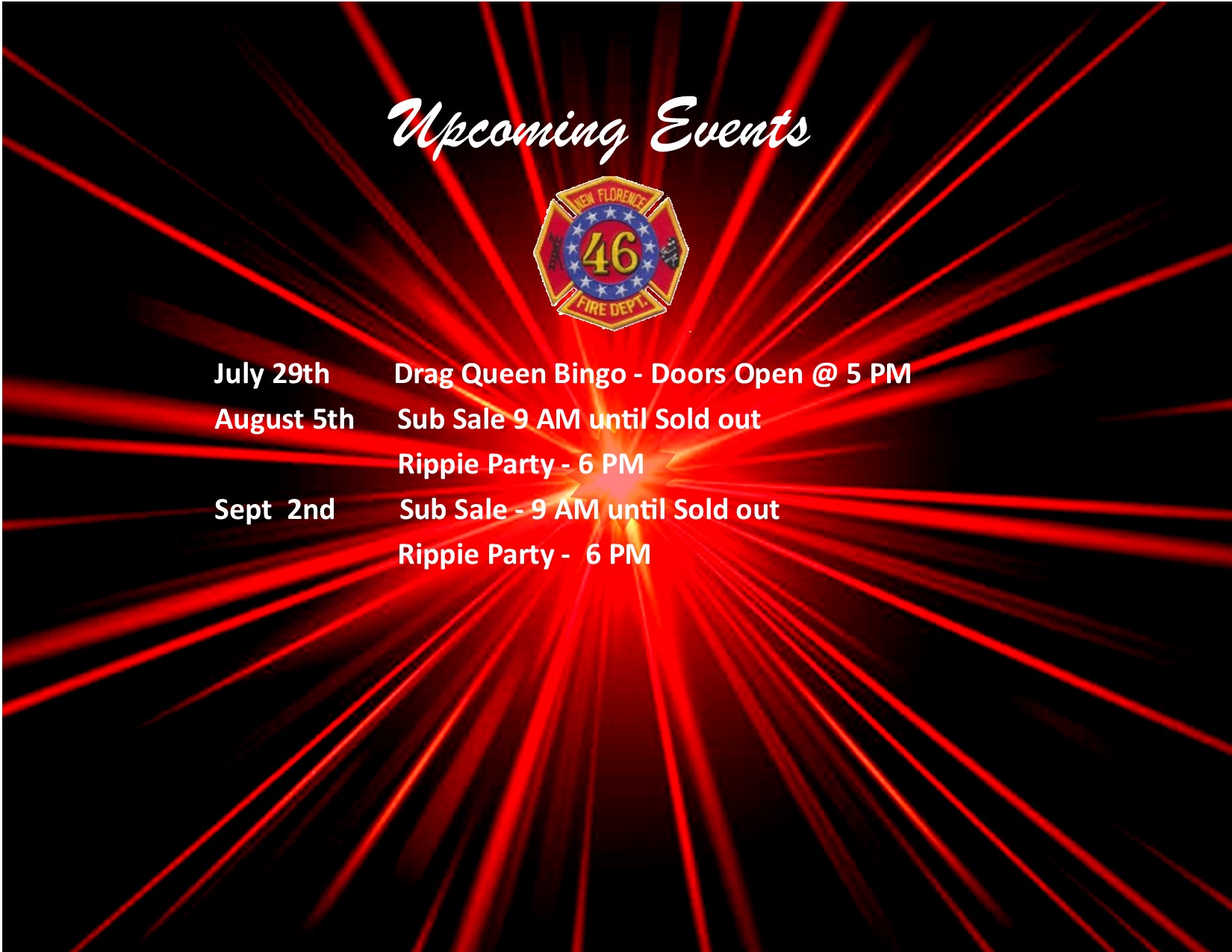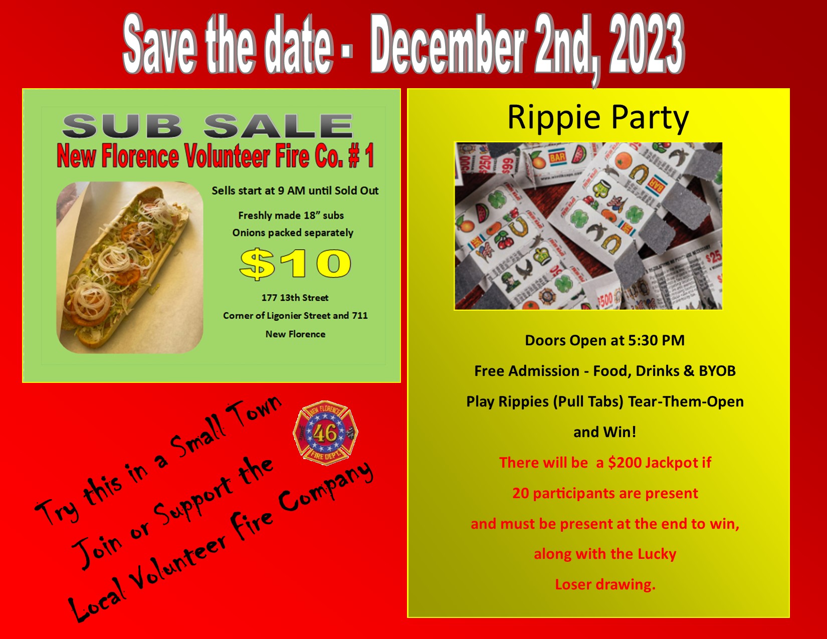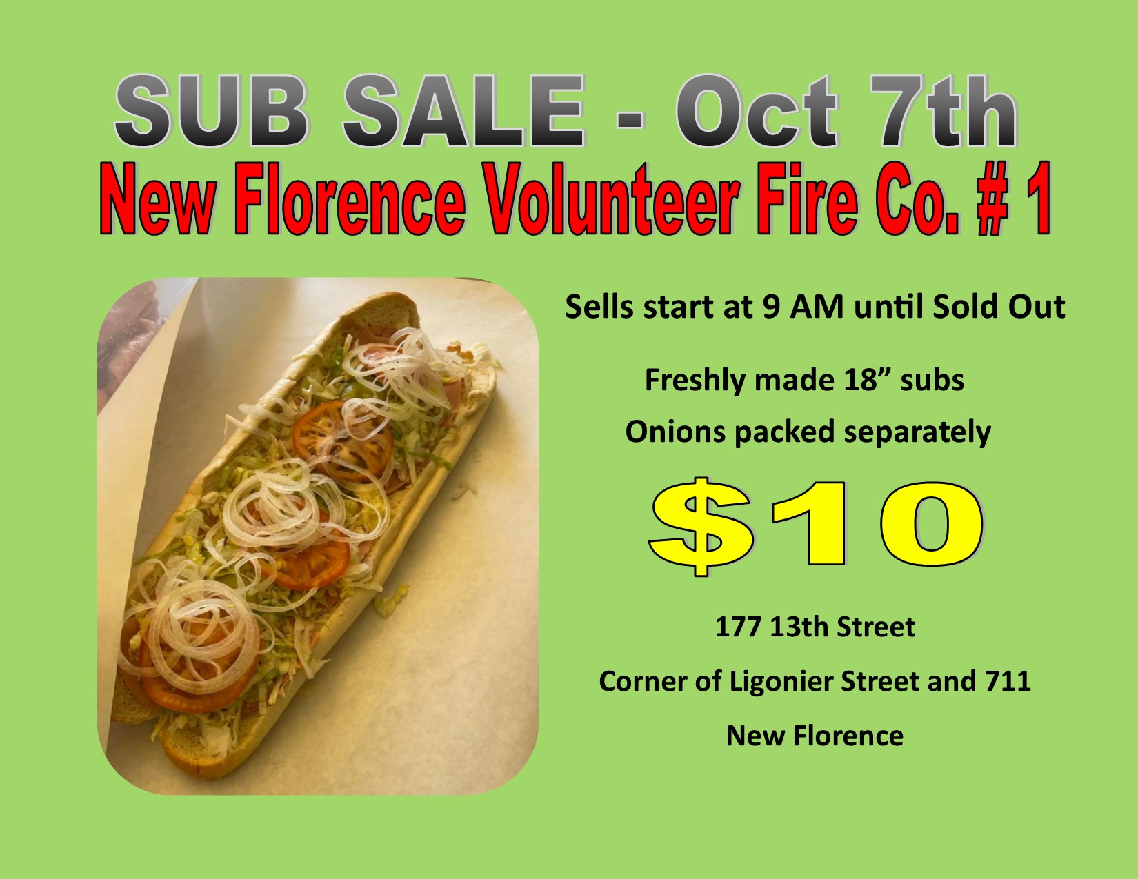 The New Florence Volunteer Fire Department will be holding another sub sale fundraiser. Subs will be available from 10 am until they are sold out. On some schedules you may notice this date is listed as a Chicken BBQ fundraiser. However, with the cost of chicken they are changing this date to a sub sale. If you need more information, contact the fire department. Thank you.