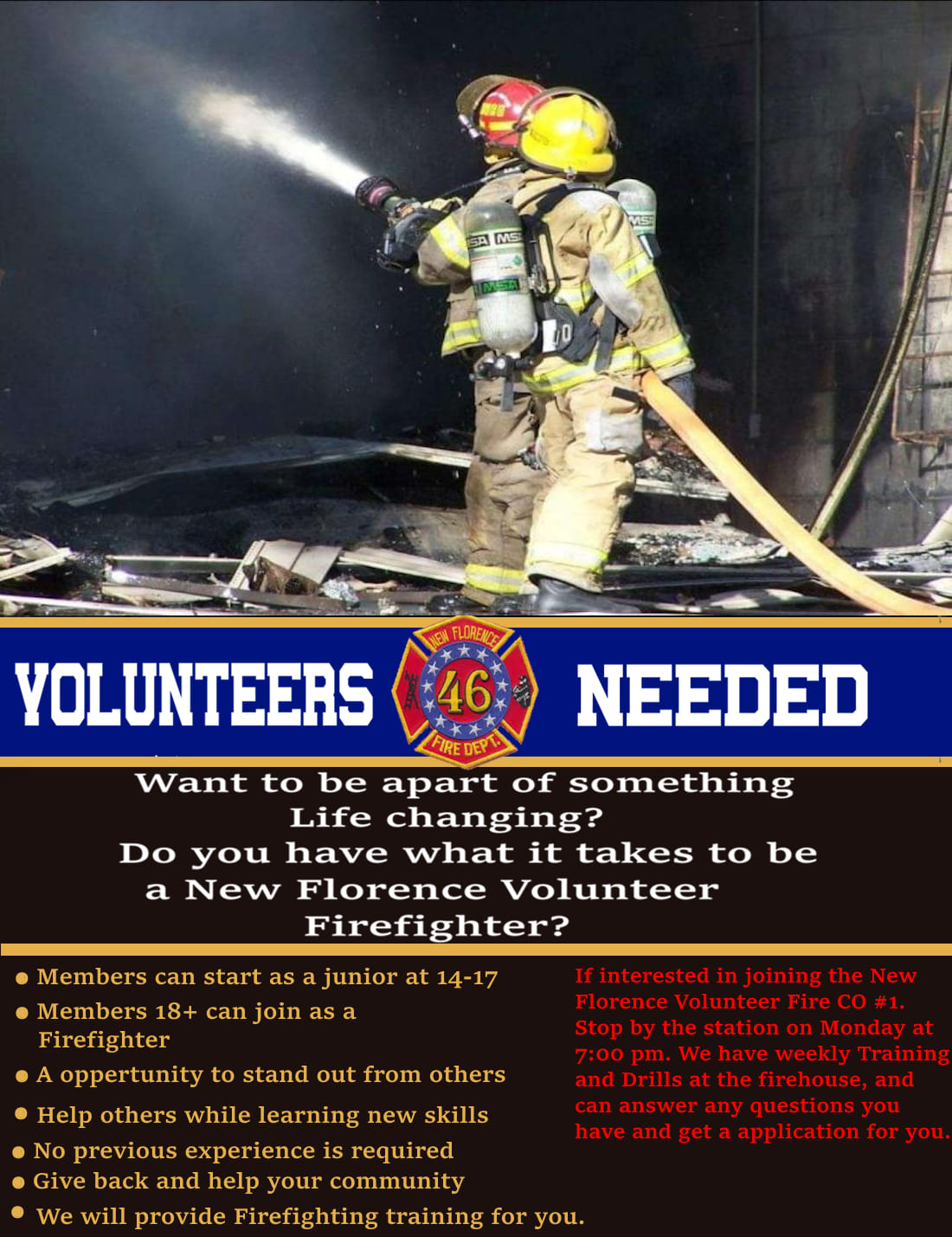 The New Florence Volunteer Fire Department did an outstanding job during the recent extended power outages around town. The fire hall was open as a warming center and drinks and sandwiches were available to those in need. Thank you for taking care of the community.