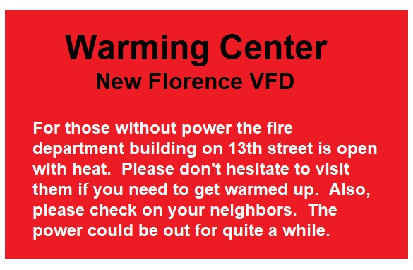 It appears power is coming back to most of the area. The outage map still shows some problem areas around New Florence. Please remain vigilant. The fire department is still open with power from a generator. If you need to charge a cell phone or that stop in, someone will be there. They also have drinks and light snacks if needed. 4 March 2023 So the power went back out again. No telling when it will be back. The VFD is keeping the warming center open for now. I’ll try and keep you updated as best I can. This morning around 8 am there were 50,000 customers without power. That number is now down to a little over 13,000. Hopefully our town gets fixed soon. The outage map shows 4 + 2 problems in New Florence. The New Florence Fire Department says power came back in town around 6:20 pm. If you don’t have service please get in touch with the power company and let them know you are still in the dark. Please be careful because there’s still trees down in places and more areas without power. Be safe. 4 March 2023