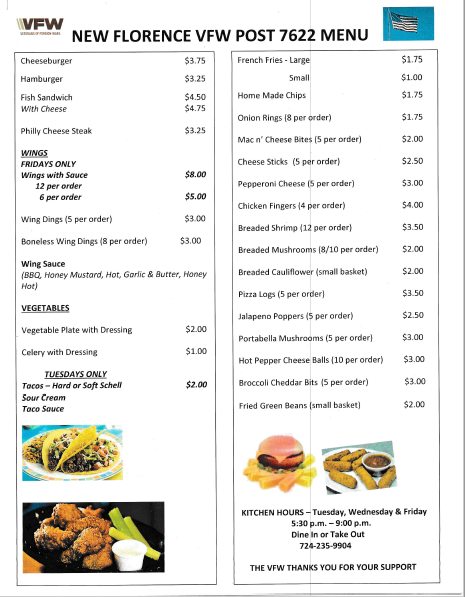 Chief Jeffrey Janciga of the St. Clair Township Police Department provided the Police Report – February 2023 for the website. At the beginning of the report is a summery that’s very informative. Also, did you know the kitchen at the New Florence VFW Post 7622 is open to the public? Recently the post put out an updated menu. Please see the flyer below for the kitchen hours and the menu. Enjoy.