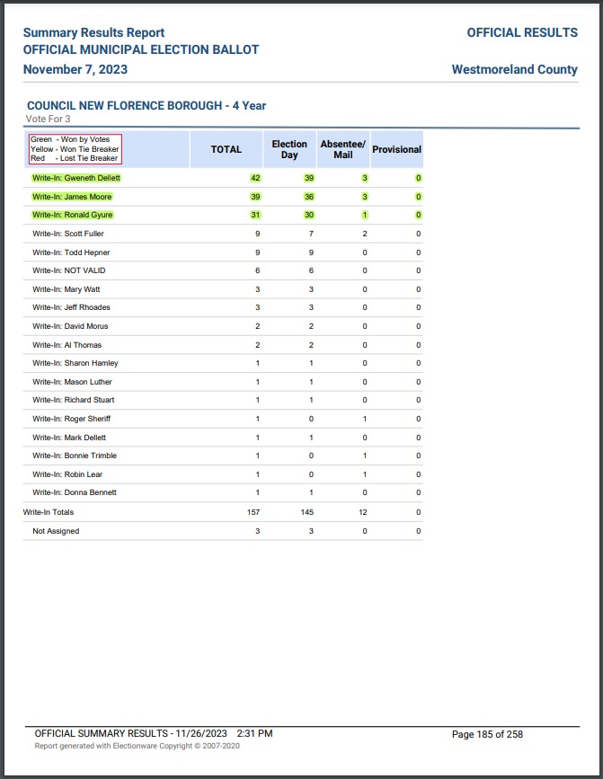 The 2023 Municipal General Election was held Tuesday, November 7, 2023. Three seats on the New Florence Borough Council were being voted on. The three positions expiring needed to be filled with write-in candidates’ names since no one ran during the 2023 General Primary Election held in May. The positions held by Jim Moore, Gwen Dellett, and Ron Gyure expire at the end of December. Below are the results of the election from the Westmoreland County website. It shows there were 157 write-in votes. Gweneth Dellett, James Moore, and Ronald Gyure received the greatest number of votes. This does not mean they will stay on council. Write-in winners have the option of turning down the positions. At this time, it’s not known if the three top vote winners will take the positions.