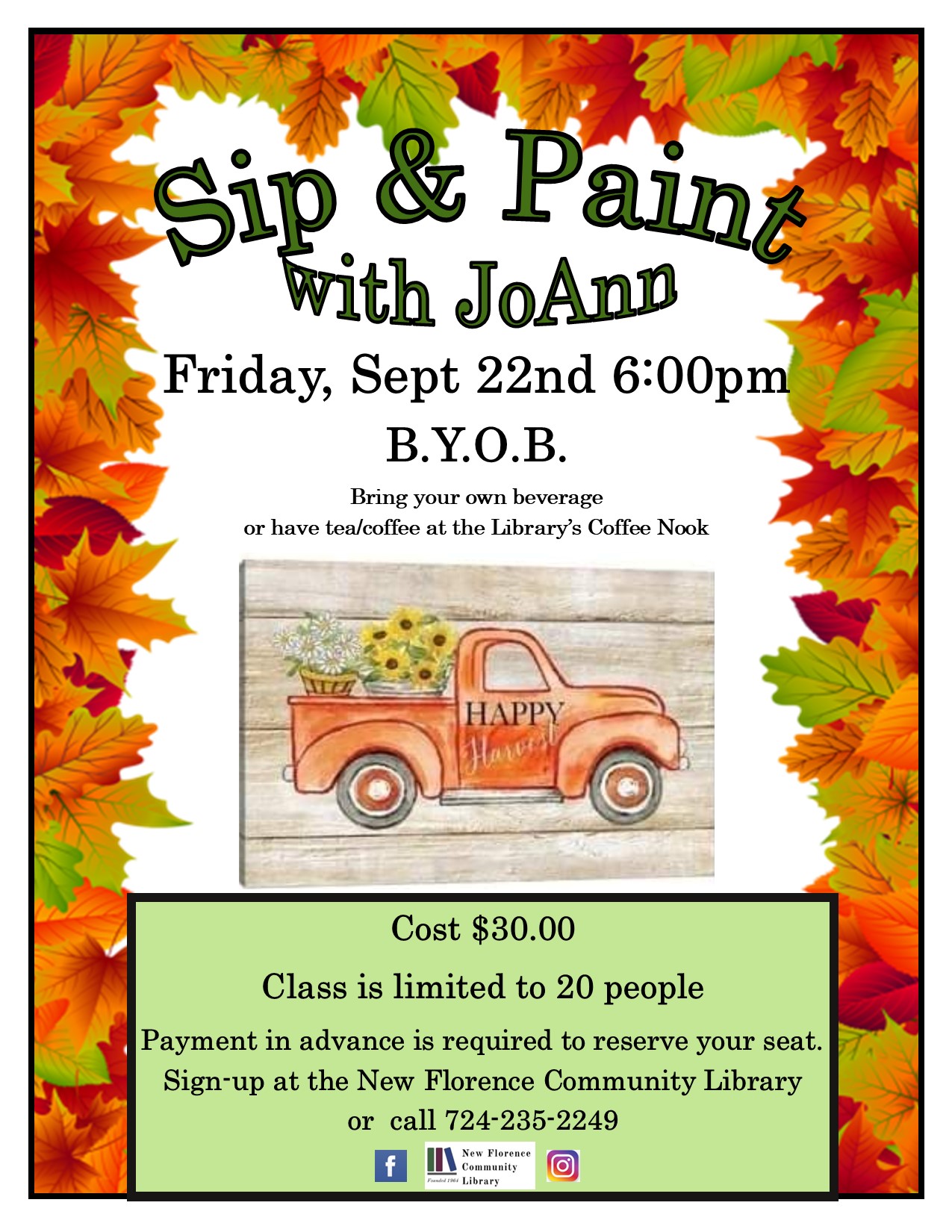 The Borough Solicitor webpage has been updated to show the change from Mr. Miller to Mr. Hewitt. Borough Solicitor Next, the New Florence Community Library has a fun upcoming event. It is a Sip & Paint with JoAnn painting class on September 22nd. The class is B.Y.O.B, bring your own beverage. Please see the flyer below for more information. Be safe in the heat everyone.