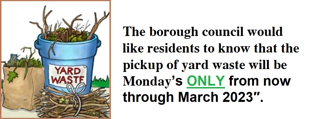 The borough council has put a ban on burning for now because of the severe risk of fires. Typically burning is allowed Tuesday and Friday evenings from 5 p.m. to 7 p.m. but not right now. A notice will be posted when normal burning can resume. Thank you.