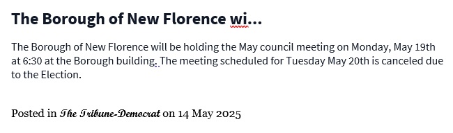 Here are some updates to the website. First, Chief Patrick M. Goggin of the St. Clair Township Police Department provided the Police Report – April 2025 for the website. Next, the New Florence Community Library has a raffle ticket fundraiser, “Vacation Fun”, for $500 cash that’s drawn on Saturday, June 21st, 2025. Also, the New Florence Volunteer Fire Department would like to remind folks of their upcoming basket party. After that the New Florence Women’s Club will hold their first meeting of 2025. The meeting is May 15th at 7 pm at the New Florence Methodist Church which is handicapped accessible. Please bring some ideas to discuss for this year’s activities! Dessert will be provided by officers. There will also be a Women’s Tea at the New Florence Methodist Church at 1 pm on May 10th. Finally, the Pennsylvania 2025 Primary Election will be held on Tuesday, May 20th, 2025. Polls will be open from 7 am to 8 pm. The Democrat and Republican ballots as of 7May2025 are listed in the event. There is also a New Florence specific referundum question on the ballot. Please see the flyers below or the Calendar for more information. Thank you.