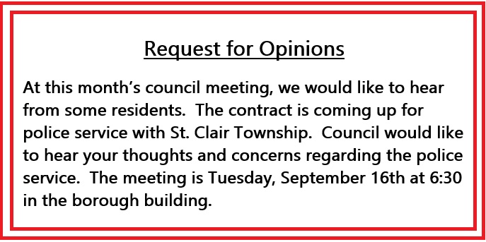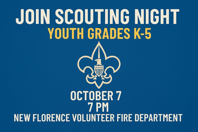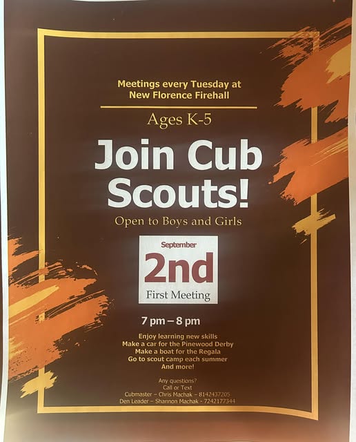 Here are two updates for the website. First, Chief Patrick M. Goggin of the St. Clair Township Police Department provided the Police Report – September 2025 for the website. Also, the Cub Scouts are having another meeting on October 7th at the New Florence Volunteer Fire Department building at 7pm. If you have any questions, please text or call Cubmaster Chris Machak at 814-243-7205 or Den Leader, Shannon Machak at 724-217-7344. Please see the flyer below for more information. Thanks.
