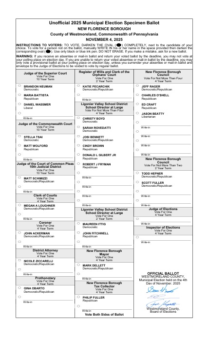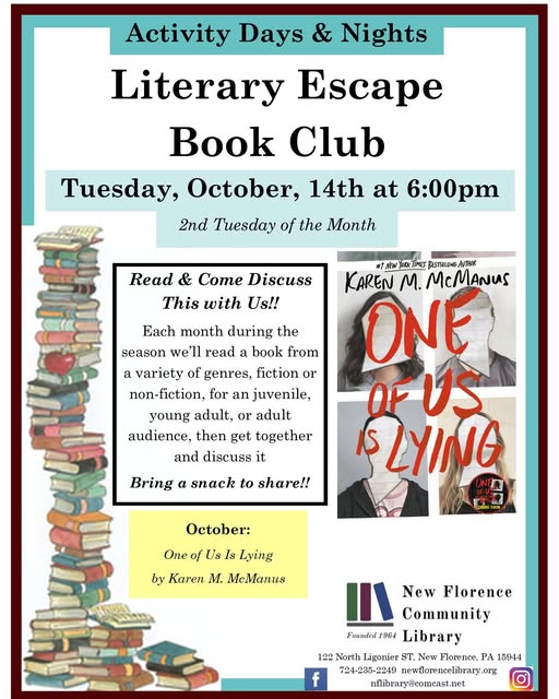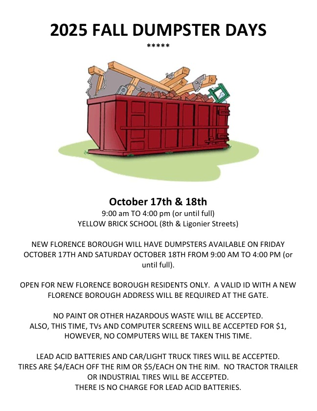Here are quite a few updates to the website. First, here are the minutes from the August borough council meeting. MINUTES 08-19-25 Next, the New Florence Community Development put out information on the corn hole tournament they’re having during the Craft and Vendor Fair this coming Sunday. The New Florence Community Library is having another Literary Escape Book Club meeting on October 14th. The book being featured is “One Of Us Is Lying”. For those interested, the library’s Gateway Clipper Showboat Luncheon Cruise is filling up fast. If you want to go, contact the library soon. The borough council announced that fall dumpster days will be October 17th and 18th. Additionally, the New Florence Volunteer Fire Department will be having their October sub sale and rippie party on October 4th. Finally, the Municipal Election is coming up in November. Six of the seven council seats are up for election. Gwen Dellett’s seat is the only one not up for reelection. The council got out of whack when write-in candidates decided not to accept the positions. When that happens, the council can only appoint a replacement until the next elections are held. The borough council will have four 4-year term positions and two 2-year term positions on the ballot to get back on track. An unofficial ballot is shown below. Here it is as a pdf. Unofficial 2025 Municipal Election Specimen Ballot – New Florence Borough I will post the official ballot once it becomes available. Please see the flyers and images below for more information. Thanks.
