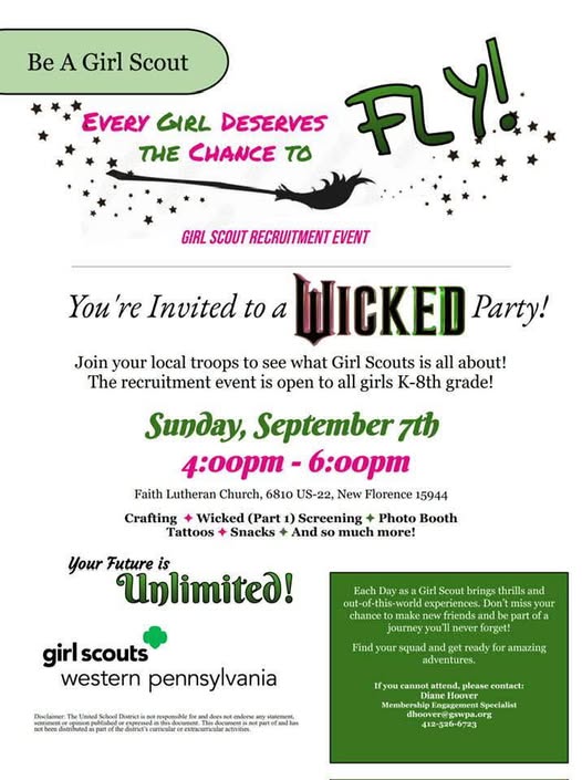 Here are a couple of updates for the website. First, with school starting back up, the area Scouting groups are getting going again. The Cub Scouts are having their first meeting on September 2nd at the New Florence Volunteer Fire Department building. The Girl Scouts are having a Wicked Party on September 7th at the Faith Lutheran Church on Rt. 22. Check out the flyers below for more information on these meetings. Next, the New Florence Community Library is having another Boscov’s “Friends Helping Friends” fundraiser again this year on October 22nd. This event helps the library raise funds for various activities. Finally, Monday is Labor Day. Please enjoy the holiday with family, friends, BBQs, and such. Be safe and have a wonderful time. Cheers.