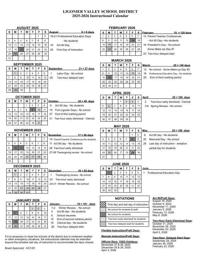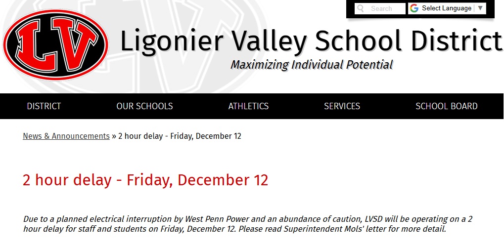 Just a quick note for everyone. The Ligonier Valley School District will have a 2-hour delay on Friday, December 12th, due to a West Penn Power planned power outage. Please plan appropriately. LVSD Two Hour Delay Letter for 12 Dec2025 Power Issue Thanks everyone.