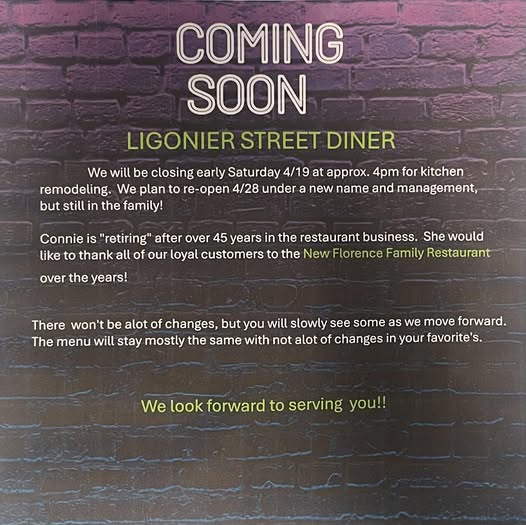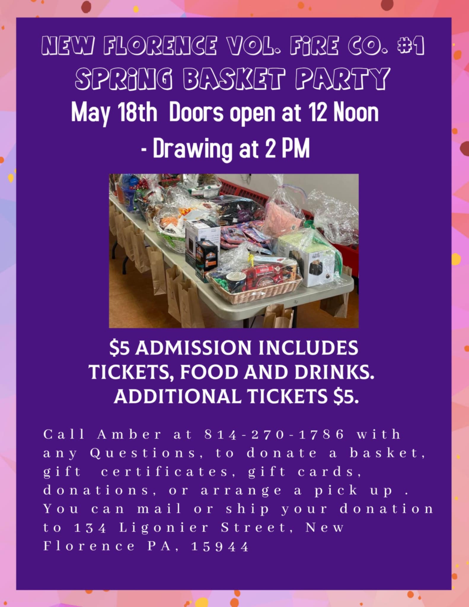 Here is a quick addition to the website. The New Florence Volunteer Fire Department put out a nice flyer for their Spring Basket Party on May 18th. It’s shown below. Also, the New Florence Family Restaurant, now called the Ligonier Street Diner, opened after their 9-day remodel and rebrand. They’re having issues with their telephone change but that should get fixed today. Cheers all.
