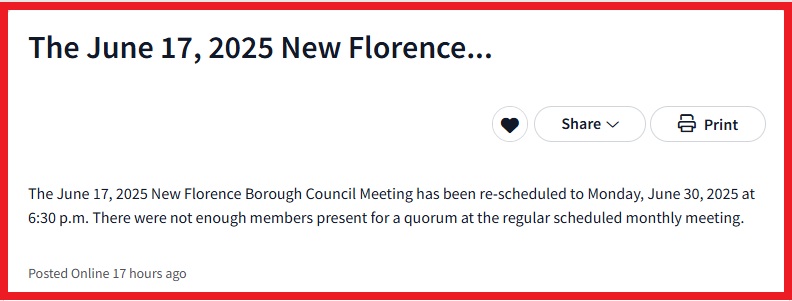 Just a quick update to the website. I’ll add more later today. Here is the agenda for this month’s borough council meeting on September 16th. AGENDA 09-16-25 Additionally, Jason Beatty, the New Florence Borough Council President, and the council members are requesting opinions at this month’s meeting on how well the St. Township Police Department contract is working in New Florence. If you have something to say, please attend the meeting and let your voice be heard. Thanks.
