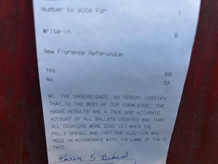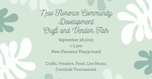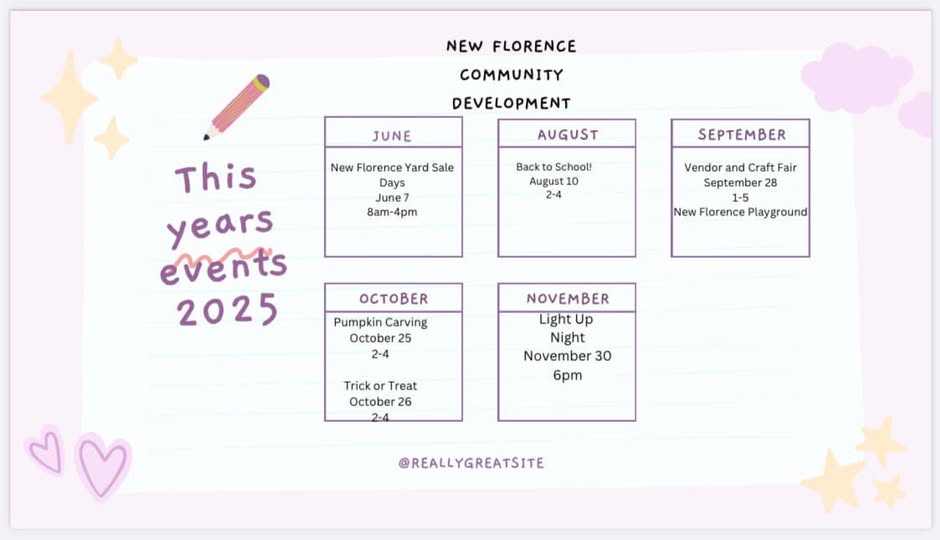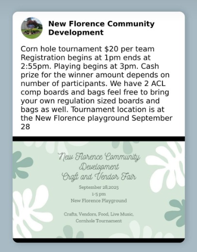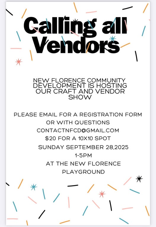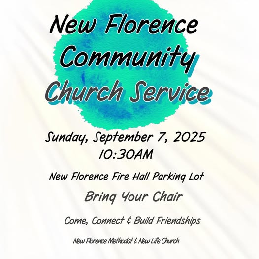 Here are a couple of updates for the website. First, the New Florence Volunteer Fire Department has cancelled tonight’s Rippie Party due to a conflict. Next, Chief Patrick M. Goggin of the St. Clair Township Police Department provided the Police Report – August 2025 for the website. After that, the New Florence Community Library will be hosting a livestream on Constitution Day out of Mt. Vernon. There will be lots of great information presented. Finally, The New Florence Methodist Church and the New Life Church will be holding a community church service at the New Florence Fire Hall parking lot on Sunday, September 7th at 10:30 am. All are welcome to attend. Have a great weekend everyone.