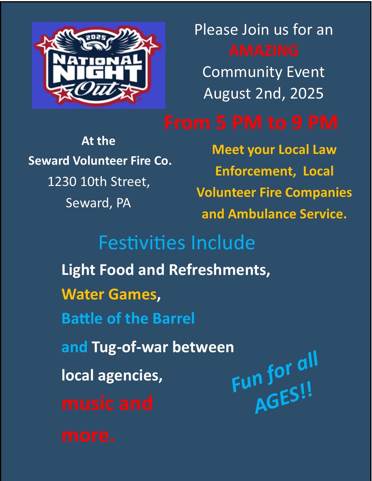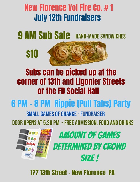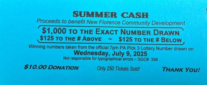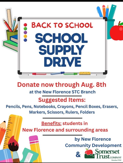 Here are quite a few updates to the website. First, here are the minutes from the June 30th borough council meeting. MINUTES 06-30-25 Next, the New Florence Community Development and the Somerset Trust Company are collecting school supplies to use at the Back To School event. More information is in the flyer below. Also, this year’s National Night Out will be held at the Seward Volunteer Fire Co. on August 2nd. For those that attended the event last year in New Florence it was a great time for all. After that, the New Florence Community Library has a lot of ongoing summer activities. They also put out an updated flyer for the “Summer Train Ride & Lincoln Caverns Tour” adventure. The New Florence Methodist will be hosting a fundraiser Family Magic Matinee show on August 2nd at 2pm. Tickets are required to attend the show. Give the church a call for more information. Finally, the New Florence Volunteer Fire Department will be having their August sub sale and rippie party on the 2nd. They’ll also be holding their Fall Gun Bash on September 20th. Tickets are now available. Please see the flyers below or the Event Calendar for more information. Thanks.