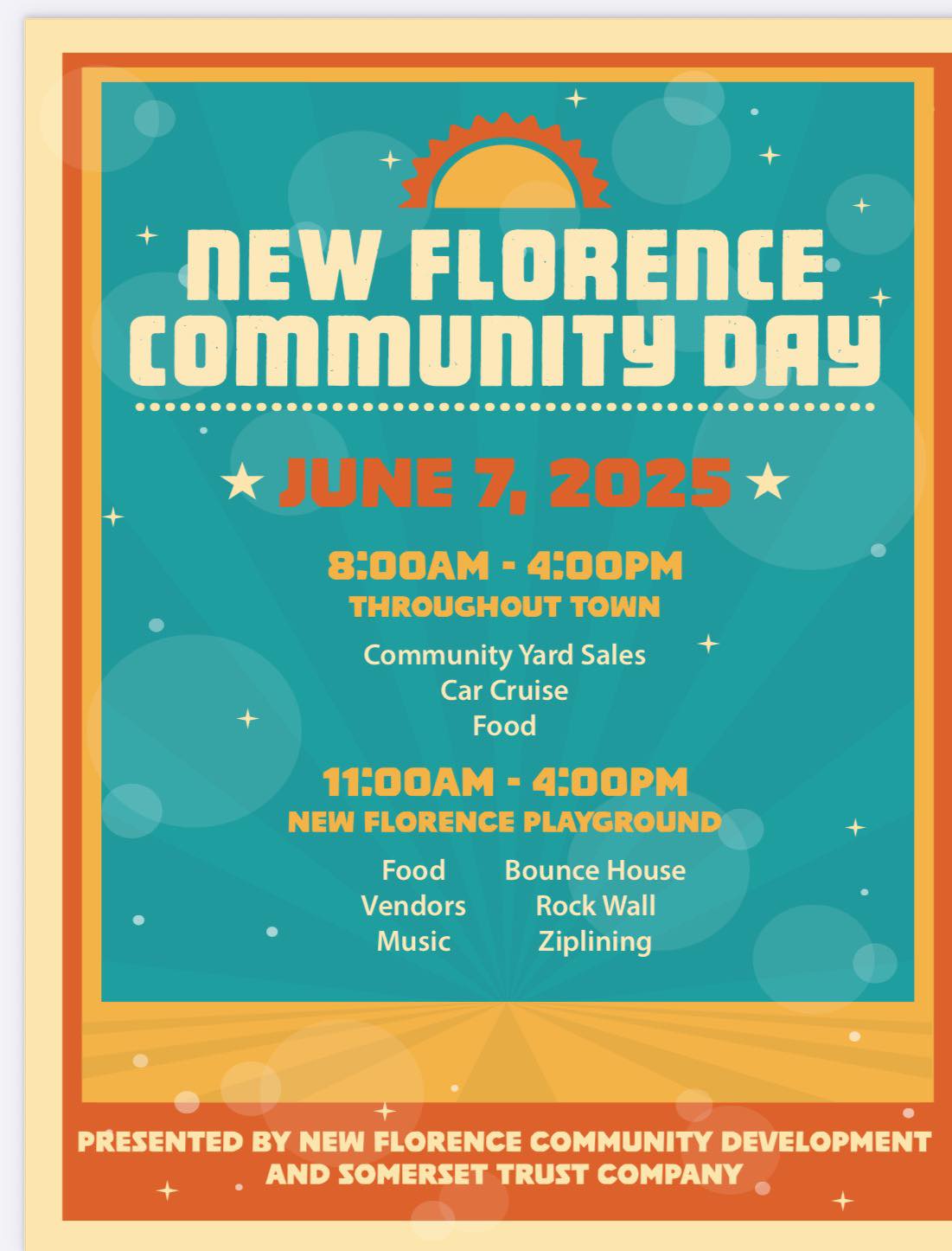 Here are some updates to the website. First, Chief Patrick M. Goggin of the St. Clair Township Police Department provided the Police Report – May 2025 for the website. Next, Jeremy Auker and family will have their first produce sale of the year on June 10th starting at 4 pm. They will set up next to the post office at Bowers Mini-Storage. Most importantly, let’s all get ready to enjoy tomorrow. There’s the town wide yard sale and Community Days sponsored by the New Florence Community Development and the Somerset Trust Company. The yard sale runs from 8 am to 4 pm. There will be tons of fun activities at the playground from 11 am to 4 pm. The New Florence Volunteer Fire Department will be selling food at their building, and they will also have instant rippies to play. Of course, you can also stop and see the Lions Club at 15th and Ligonier streets and pick up a wonderful hot sausage sandwich. They bought more supplies this year so they’re hoping not to sell out before lunch. Yikes. The Lions Club will also have their June Cash Ticket available for purchase along with brooms. Now the weatherman is not forecasting a great day but don’t let a little water dampen your spirits for the festivities. Come out and have fun. Cheers.